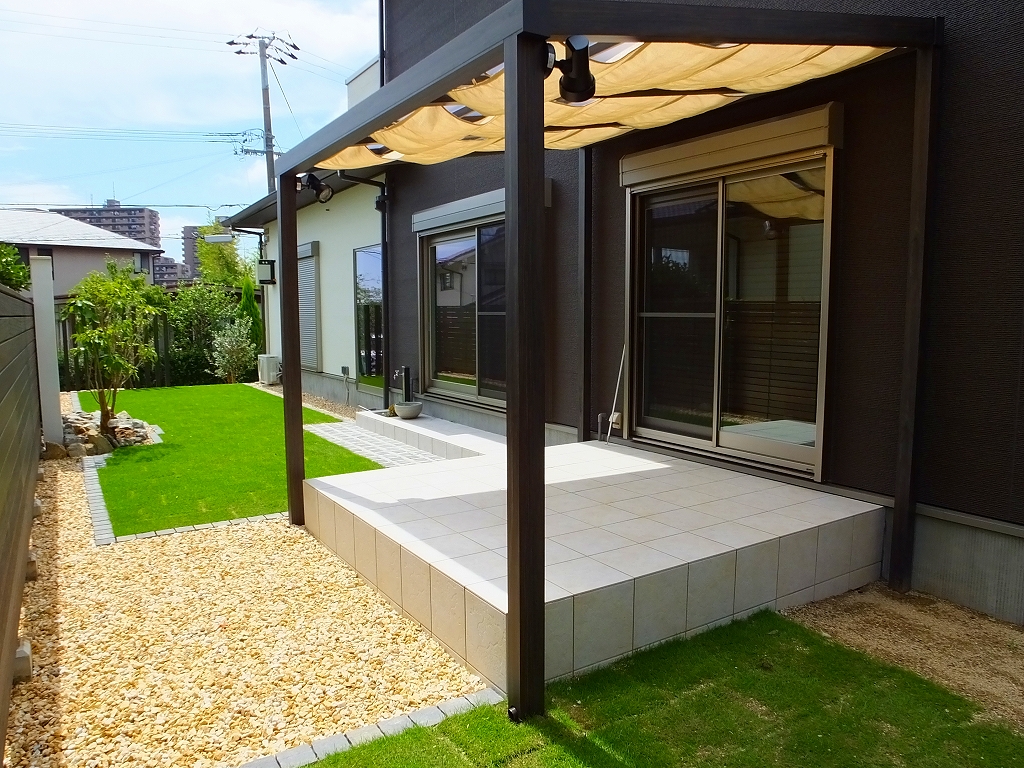 タイルテラス部分にはタカショーのポーチテラスを設置しました。また夜でも外に出て頂けるようにスポットライトを2か所設置しています。