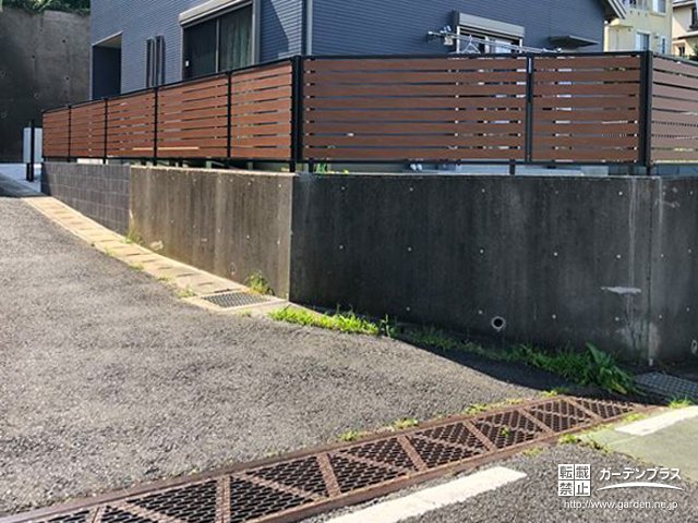 こちらはお庭をぐるりと囲むように設置した木目調フェンスです。やはり十字路に接する角地で人目が多いので、デザイン性のある木目調カラーをご提案させていただきました。周りの住宅はアルミ色が多かったので差別化にもつながりました。