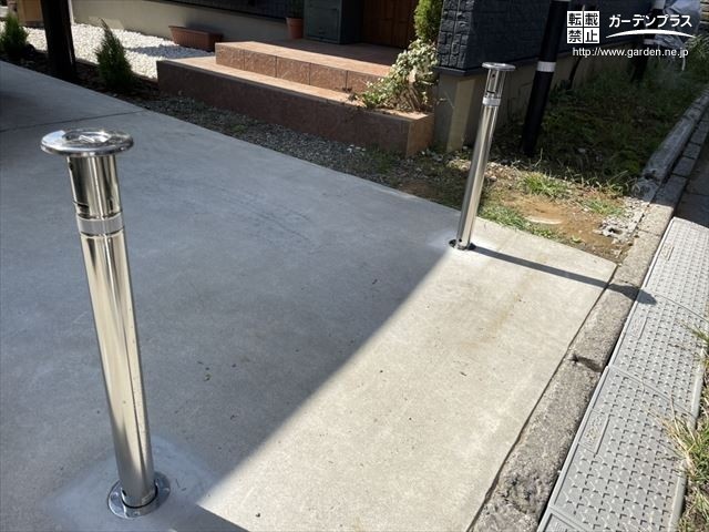 こちらは道路境界の侵入防止に設置した車止めポールです。ポールはコンクリートに埋め込み式かつ中にチェーンをしまうことができるので、出入りの際に邪魔になったりタイヤで踏んで傷めることもありません。