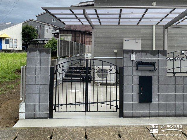 アイアン調の門扉やフェンスをアクセントに、色違いのカーポートや統一感のあるブロック使いなど、細部までこだわった外構となっています。