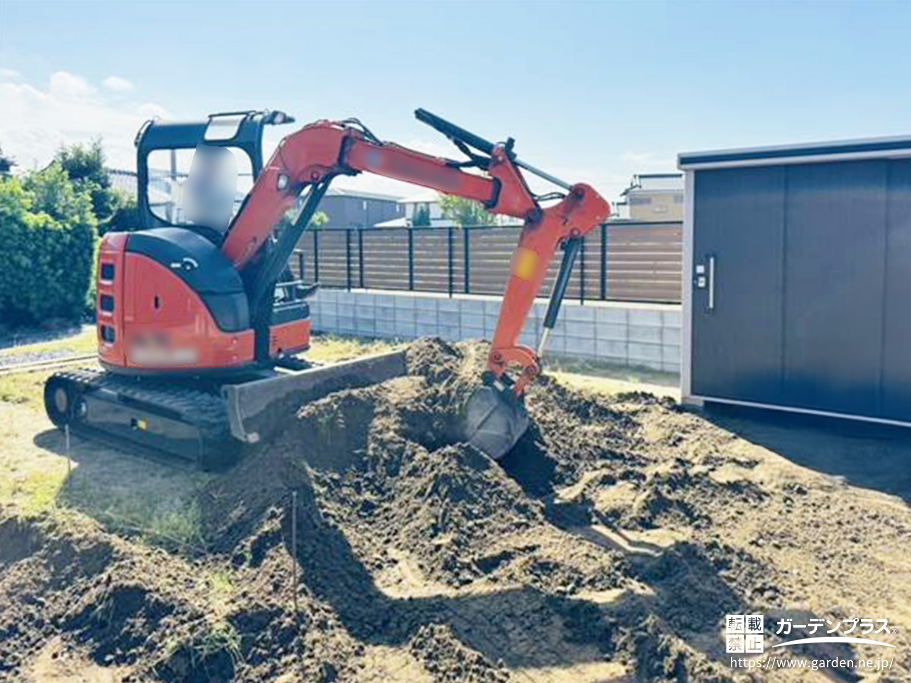 外構工事の土工事とは、お庭や敷地内の土を動かす大切な工程で、掘削・整地・埋め戻し・残土処分等、快適なお庭づくりの基礎となる作業がたくさん含まれています。敷地に石が多かったり、古い構造物が埋まっている場合には、それらを撤去・処分する作業も行い、お庭が安心して使える状態へ整えていきます!