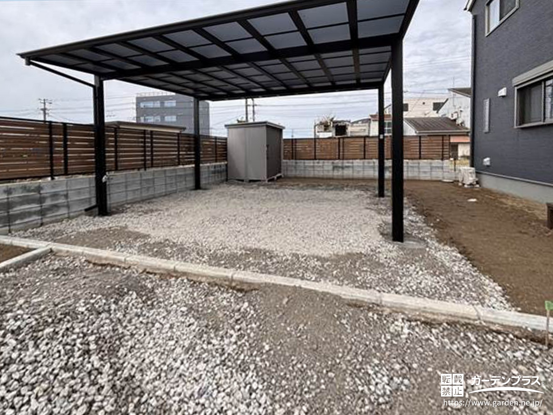 お庭に大きな屋根が加わるだけで、外構全体の雰囲気が引き締まり、快適な動線が生まれますね。屋根付きの駐車スペースで天候を気にせず洗車ができるなんて、本当に快適そのものです(^-^)
