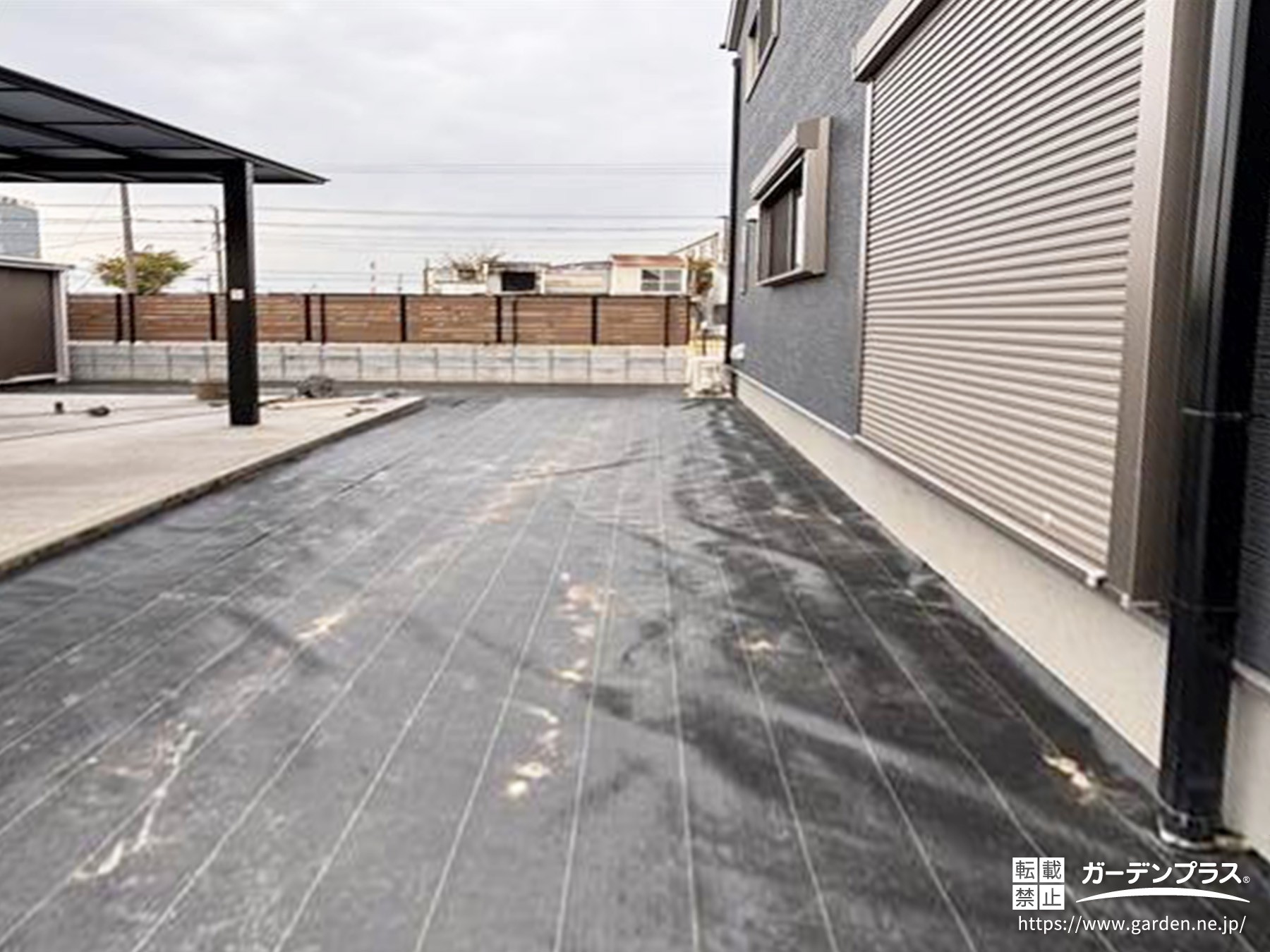 土間コンクリートの打設が完了したので、最後の工程として広いお庭スペースに防草シートを敷いていきます!