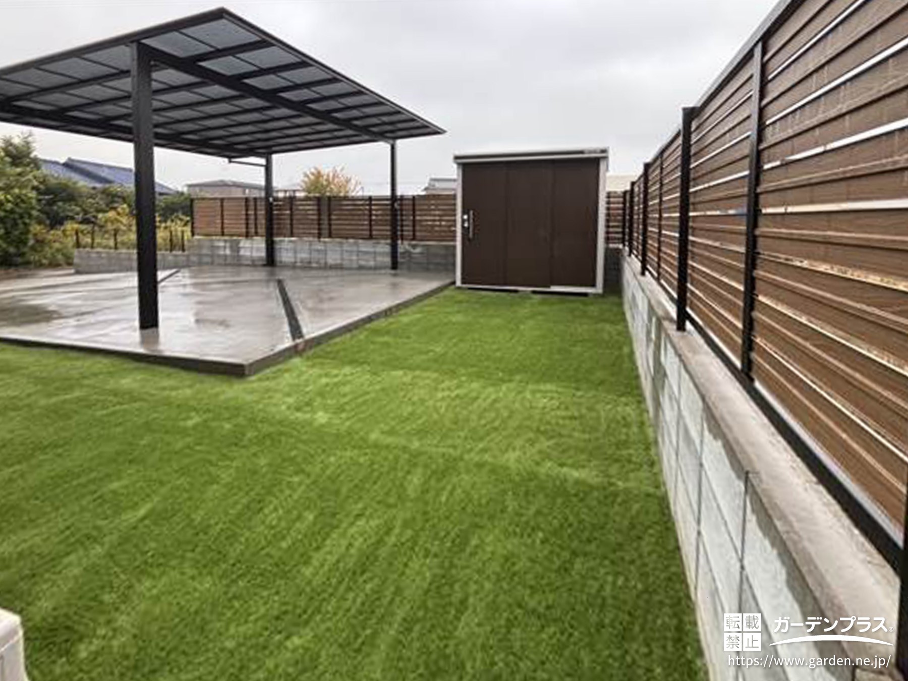 スタイリッシュなカーポート、広々とした土間コンクリート、そして一面に広がる緑の人工芝が合わさることで、お庭が一気に快適で過ごしやすい空間へと変身。