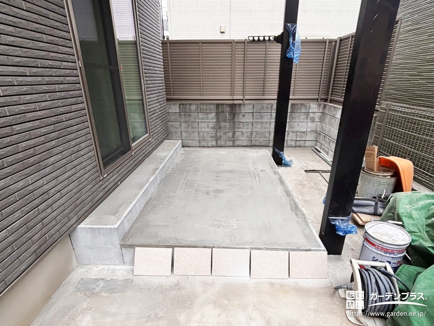 タイルデッキの中にコンクリートを流し込み養生期間中となります!