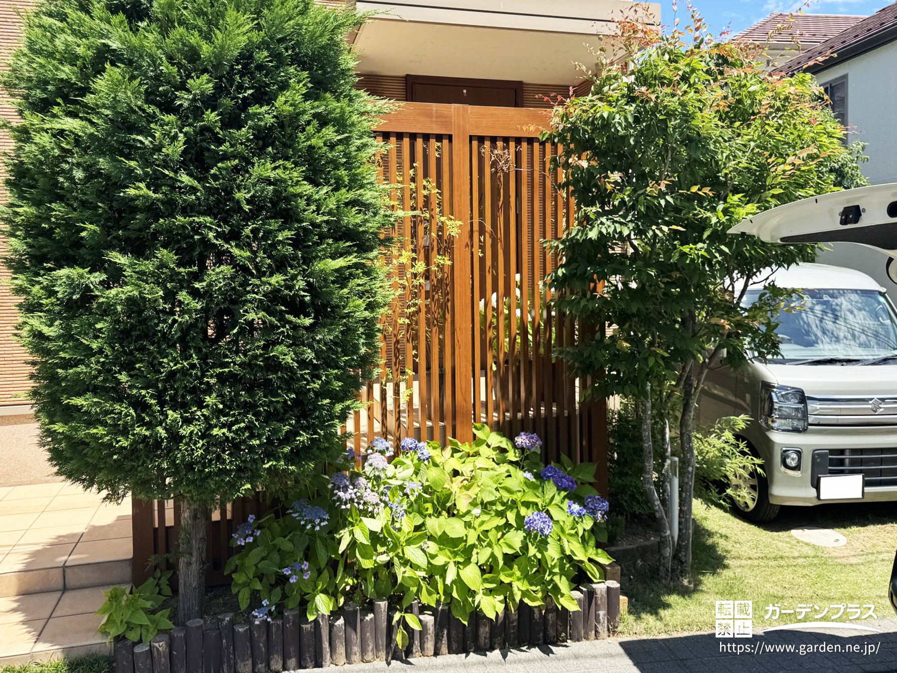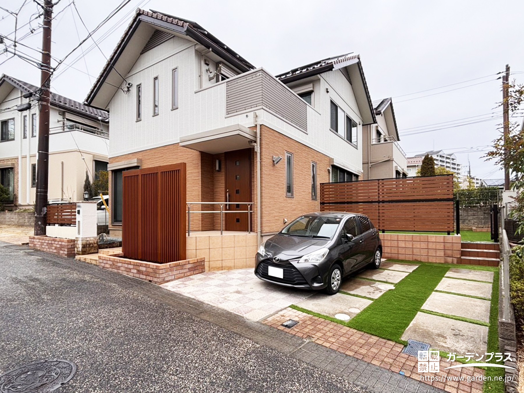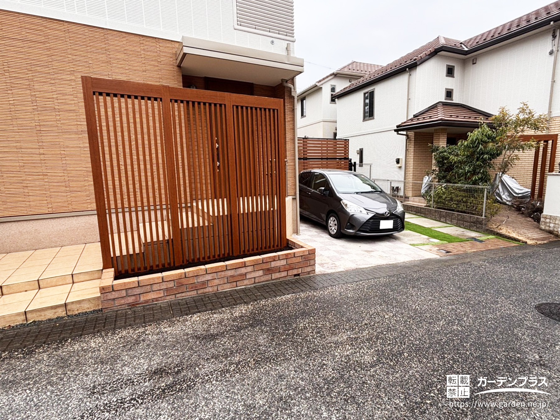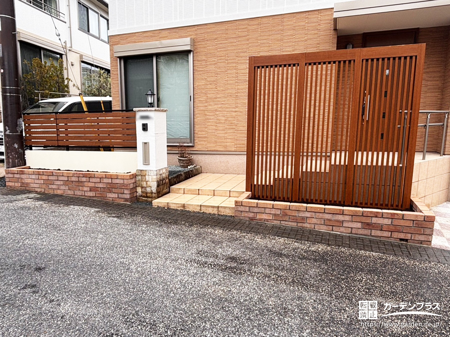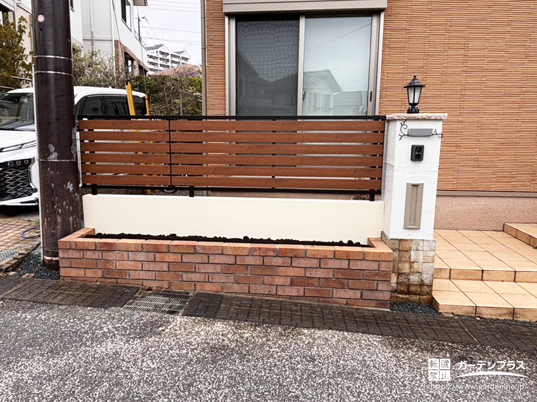 門柱の高さに合わせた目隠しフェンスを設置し、周りの視線も気になりにくい仕上がりに!