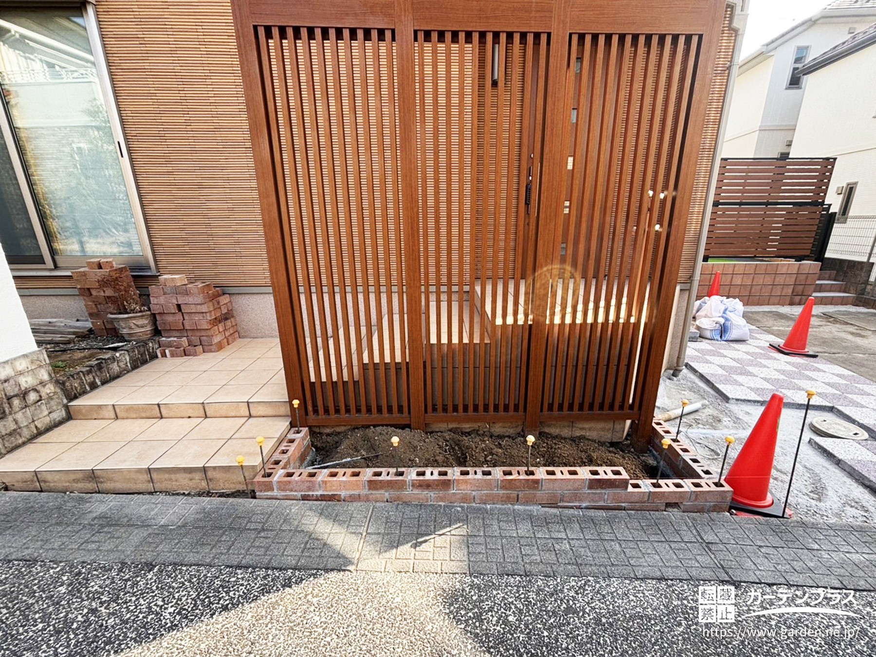 レンガの自然な色むらが美しく、玄関周りの印象がぐっと明るくなりました!基礎からしっかりと施工しているので、安心して長くお使いいただける花壇になりましたね(^_-)-☆既存の植栽を整理したことで、全体もすっきりまとまり、より使いやすい空間になっています♬これから花壇にお花や植栽が入ることで素敵なお庭になっていくのが楽しみですね(^^♪