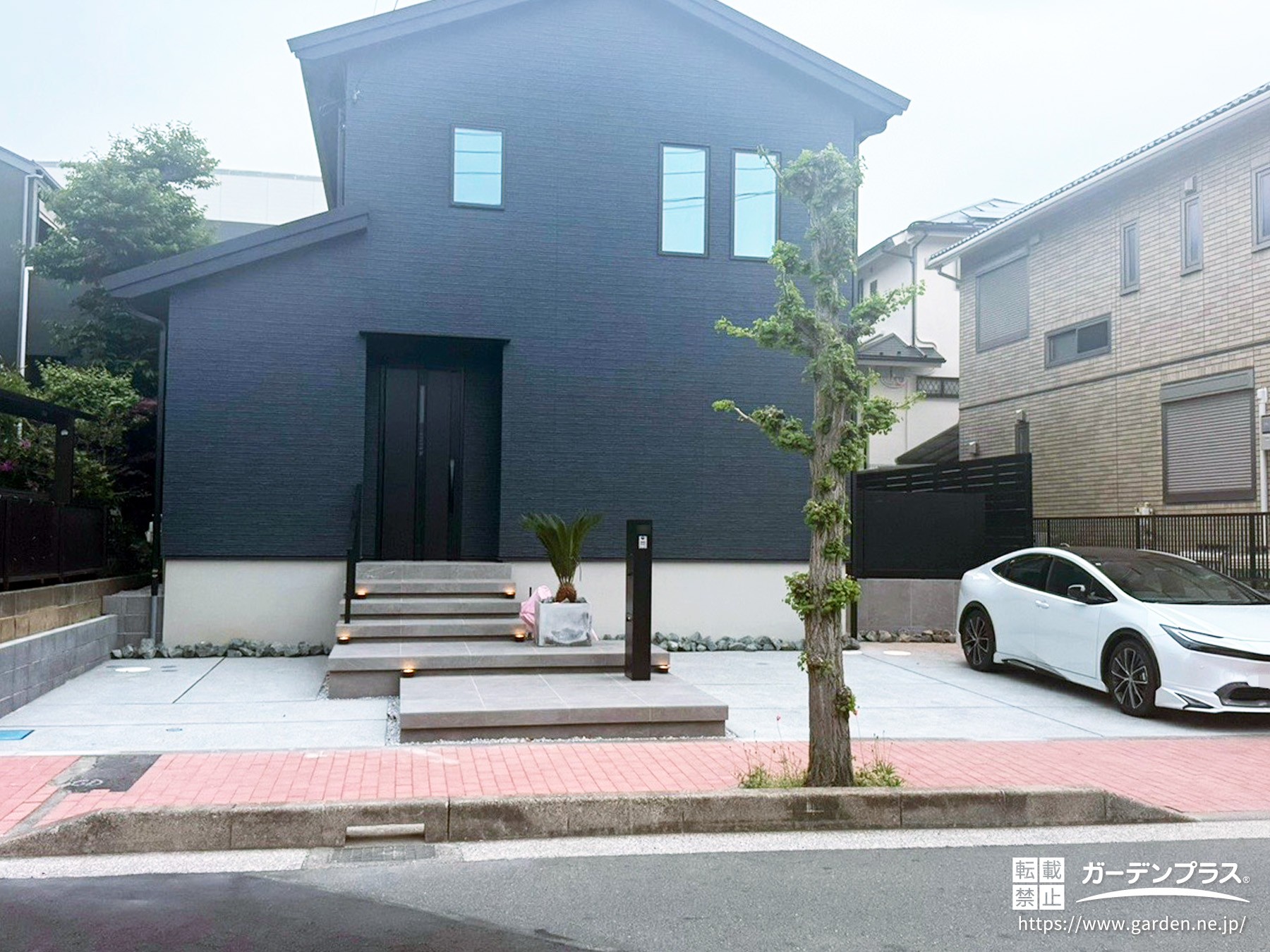 浮き階段がアクセントを加える施工後の外構