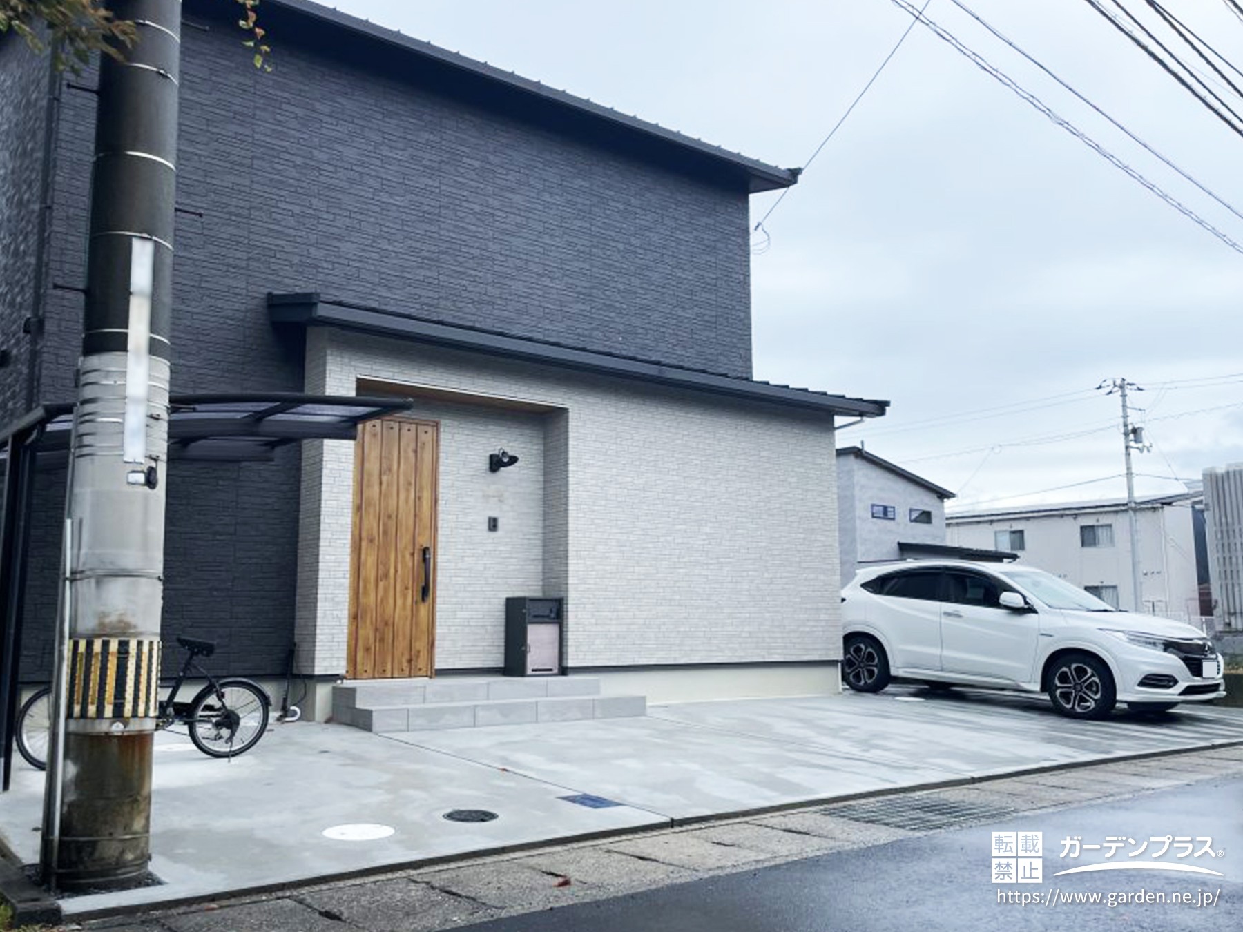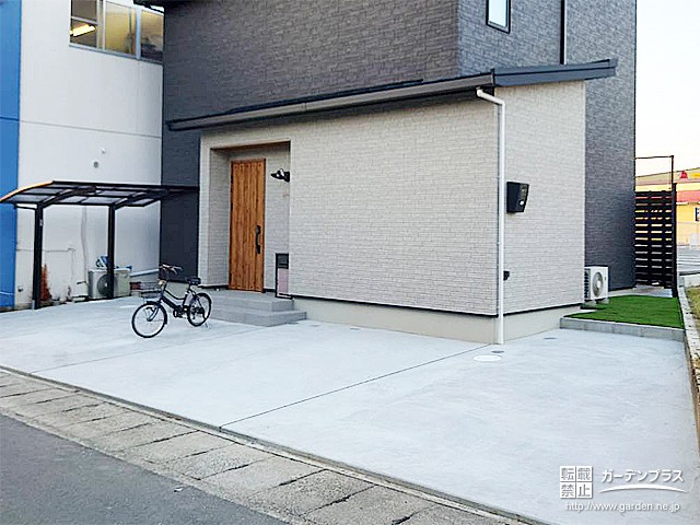 駐車スペースから裏の通路まで土間コンクリートで舗装したことで、シンプルながら清潔に利用できる実用性の高い外構が完成しました。