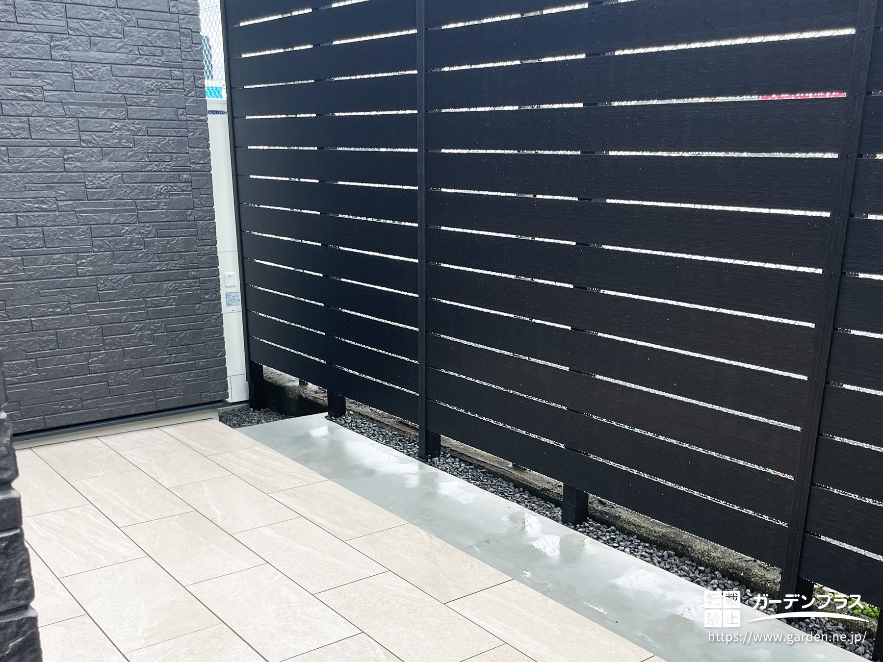 タイルデッキまわりを目隠しフェンスで囲みました。フェンスにはブラックのアルミ材を採用し、建物全体と調和する、落ち着いた印象です。