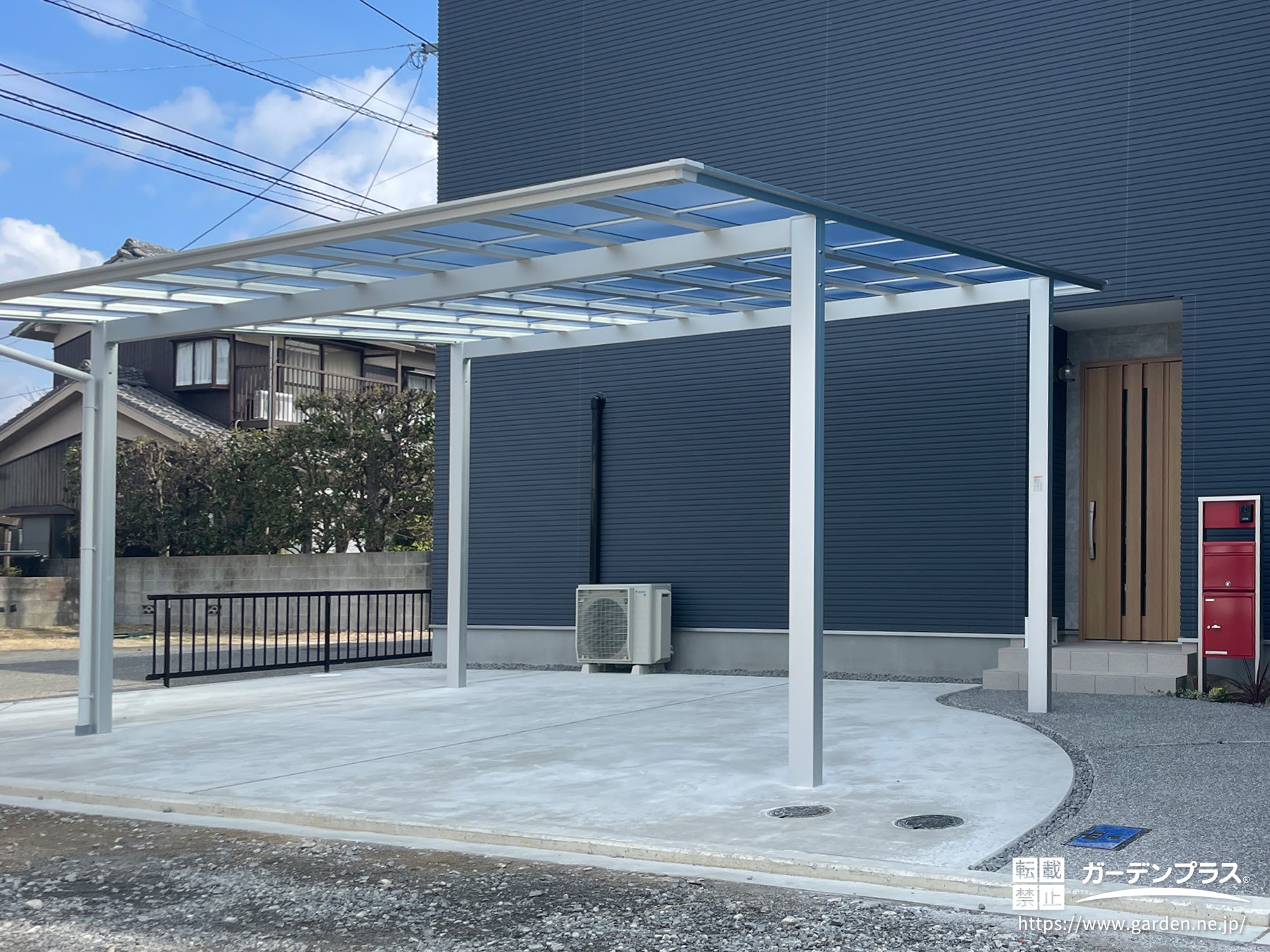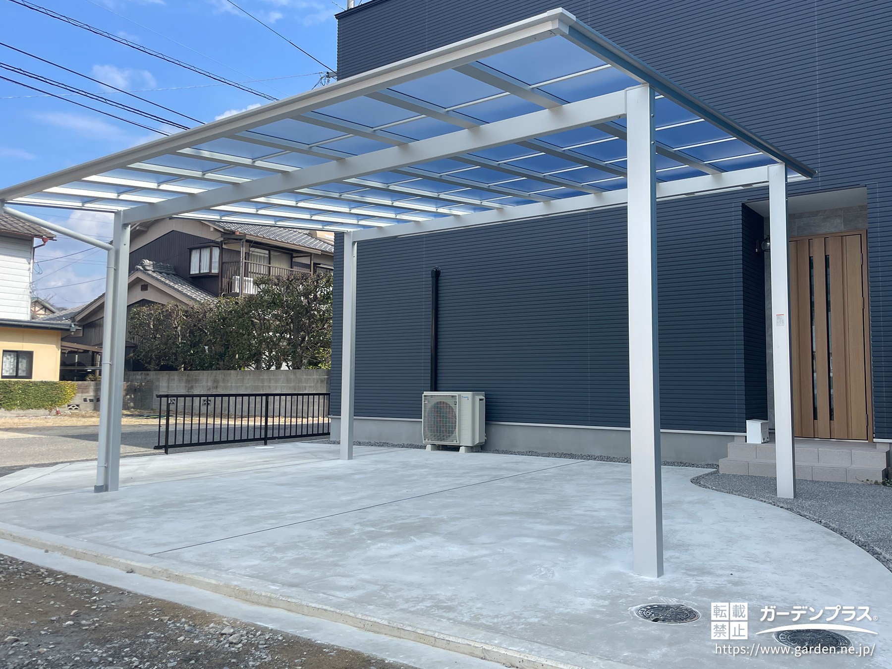 建物前は駐車スペースとしてお使いいただけるよう土間コンクリートを打設し、頭上には2台分のお車をゆったりと停められるカーポートを設置しました。