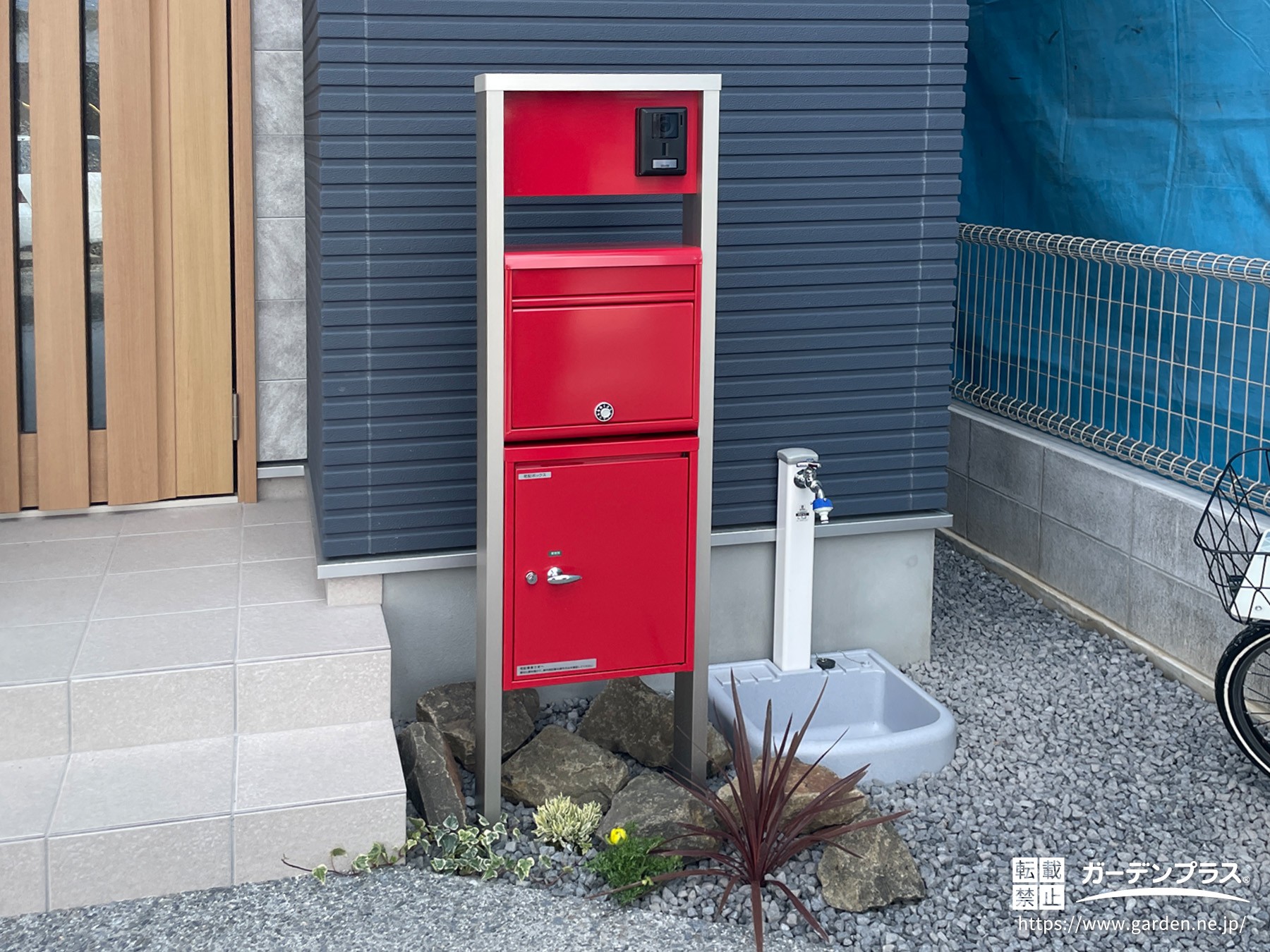 今回の外構では、建物の落ち着いたカラーに合わせつつ、玄関まわりのアクセントとなる赤色の門柱を採用しました。