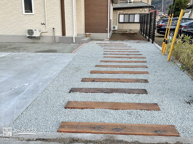 続いてご紹介するのは、枕木材の温かみを感じられるナチュラル玄関アプローチです。