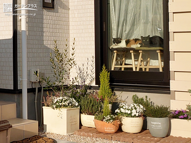 お施主様の飼い猫の日課がリビング窓から外の景色を眺めたり日向ぼっこすることだそうで、リビング前はオープンのまま、玄関前以外の窓に面した塀とフェンスは低めに設定いたしました。外への視界をしっかり確保しましたので、日課のパトロールもはかどりそうですね。