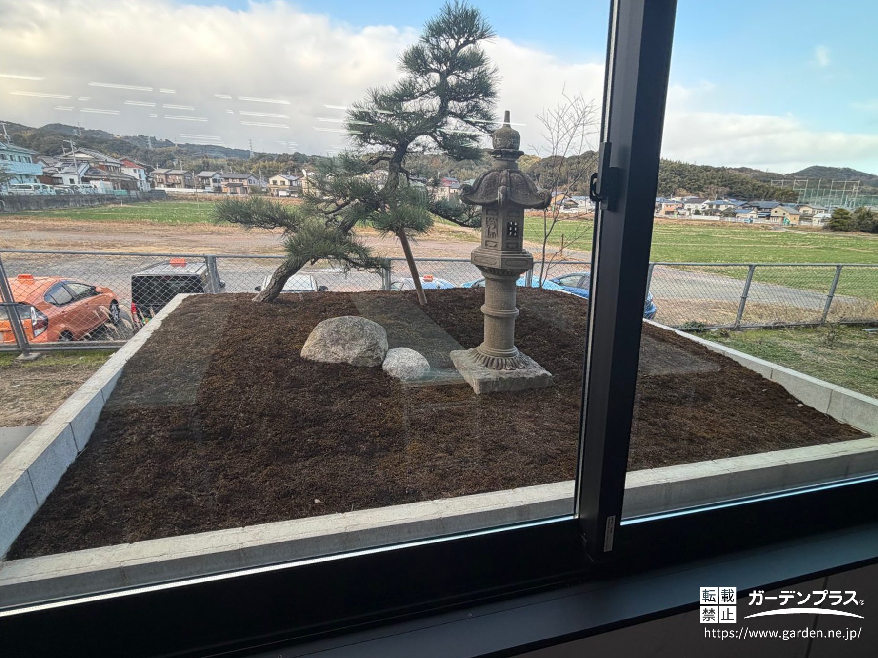 まずは造園の職人が入り、松やモミジといった和風の坪庭にふさわしい植栽を一つひとつ丁寧に配置。松の枝ぶりを見極めながら剪定を行い、どの角度から見ても美しく映るよう整えていきます。さらに灯籠を据え、足元にはスギゴケを敷き詰めることで、坪庭全体に落ち着いた和の表情が広がりました。窓越しに眺めたときのバランスにも配慮されており、奥行きや陰影がしっかりと感じられる仕上がりです。