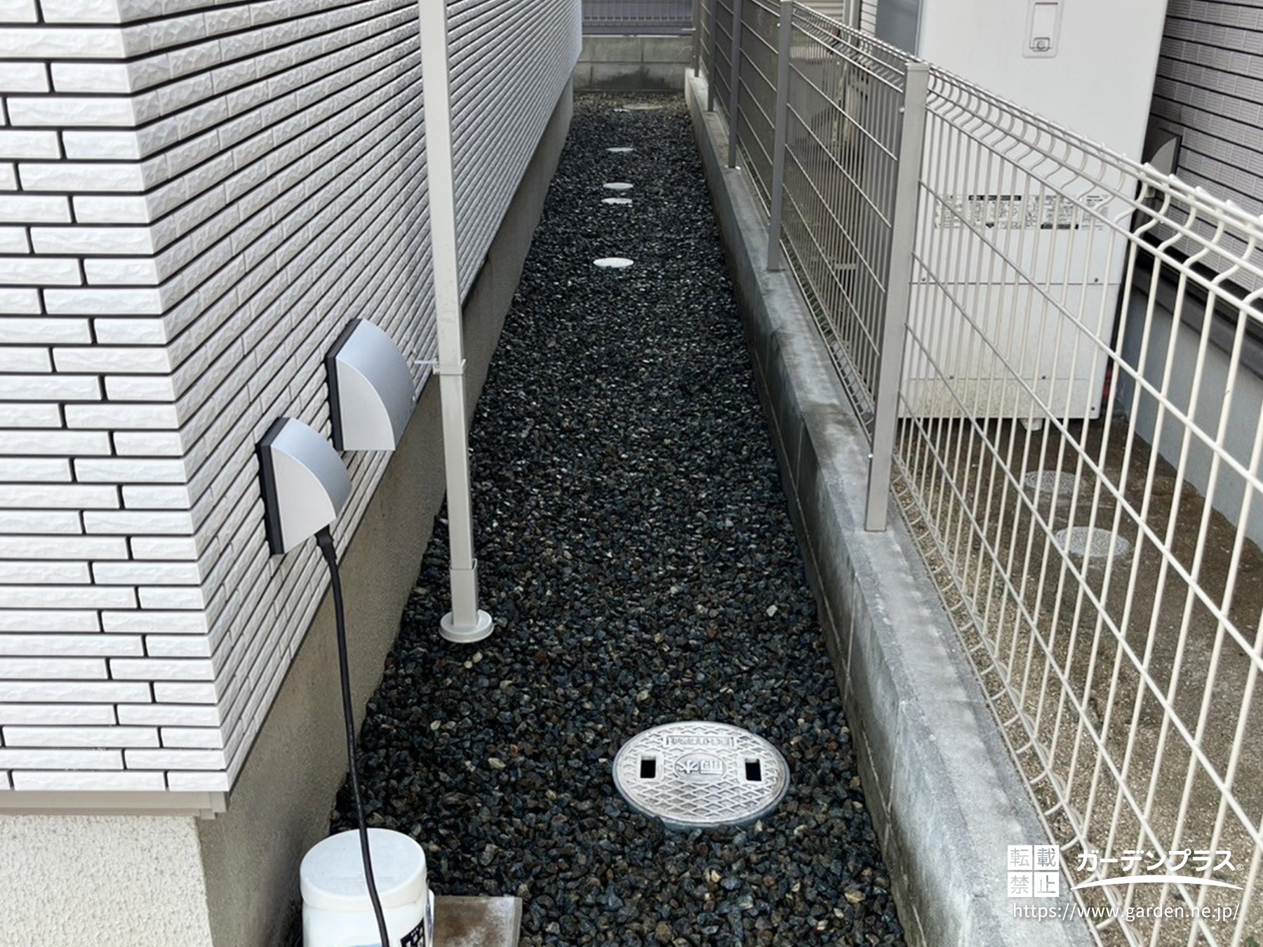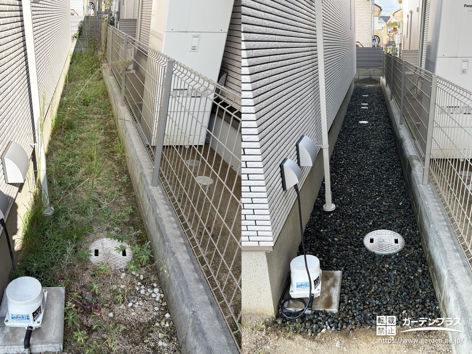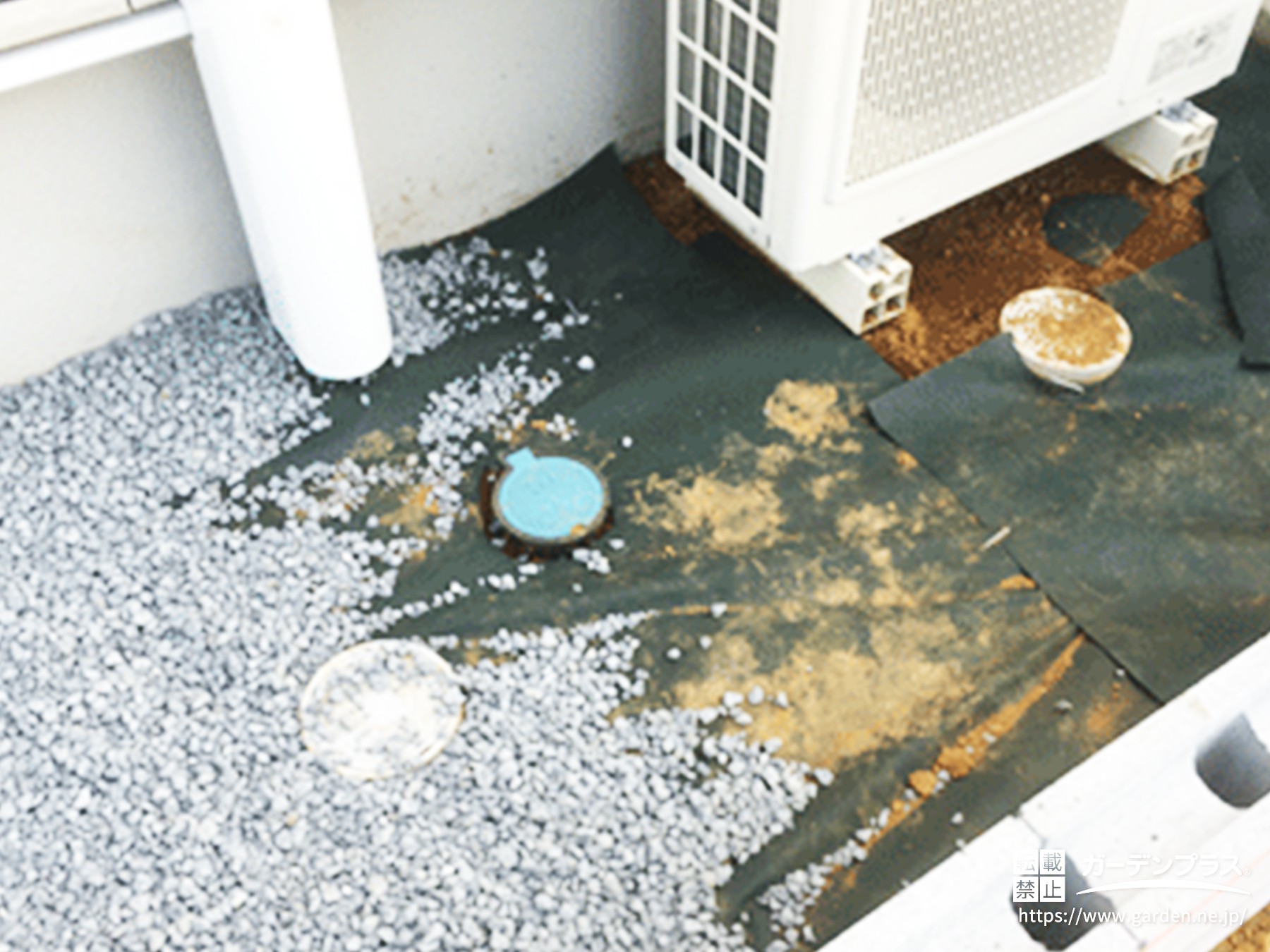一度現状の土をとって防草シートを敷き詰め、上から砂利を敷き詰めております。