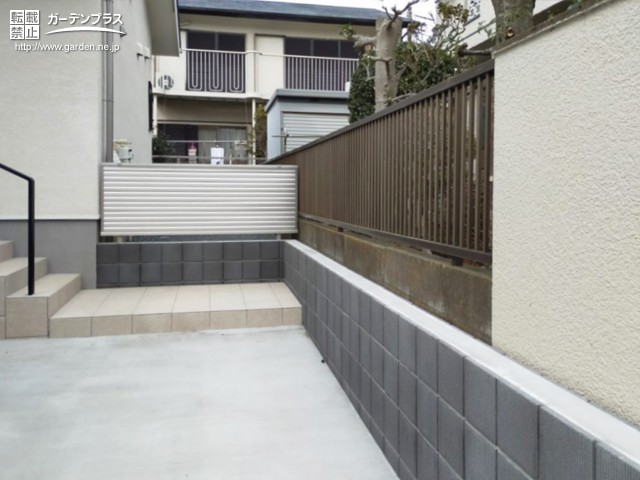 造作したアプローチ階段の奥はファサードと統一感がでるように、道路沿いの土留めブロックや目隠しフェンスと同じ商品で施工しました。