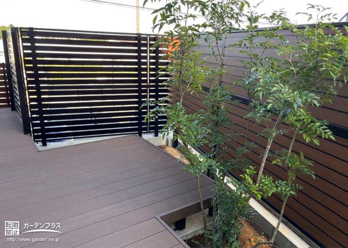 間取りと近隣事情に合わせたフェンス選びと植栽スペースを設けたウッドデッキ