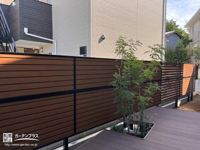 奥側やファサード側にも同じシリーズの木調のフェンスを設置しましたが、こちらはコストや圧迫感の軽減にもなるにスリット入りのフェンスを設置しました。