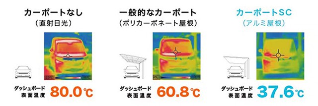 一方で、一般的なポリカ屋根のカーポートの場合(写真中央)は、紫外線や雨を防ぐことはできますが、遮熱効果が弱くカー ポートで車内温度を下げるという点ではやや物足りなさを感じます。