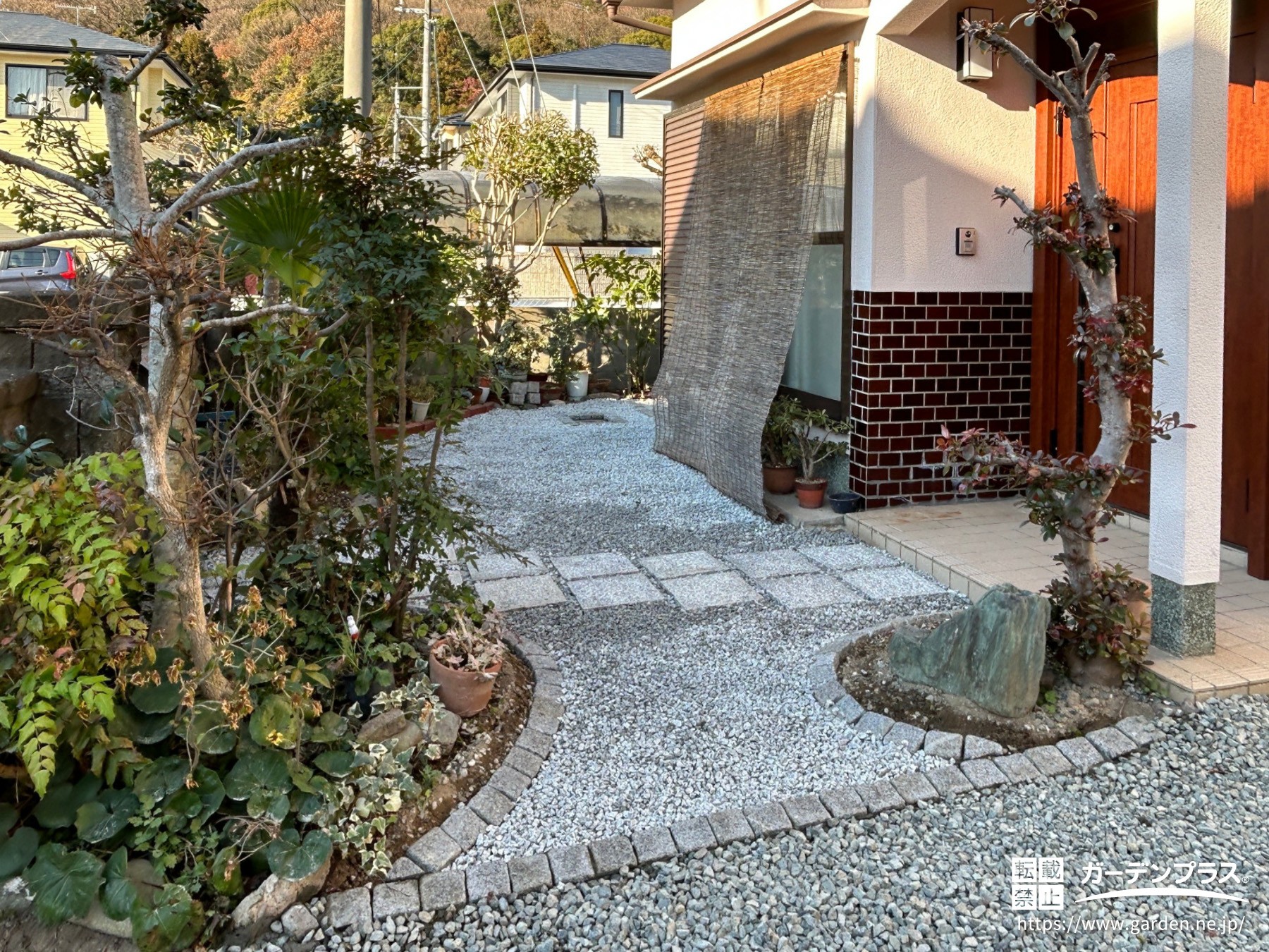 元々は足元が凸凹していて、ご年配のお客様にとっては少し歩きにくく、毎日の動線に不安が残る状態でした。今回のリフォームでは、その不安を解消するために防草シートと砂利を敷設し、雑草対策をしながら足元を平らに整えて、安心して歩ける玄関アプローチへと生まれ変わらせました。さらに、白御影石を飛び石状に配置して、見た目にも軽やかな印象に仕上げています。