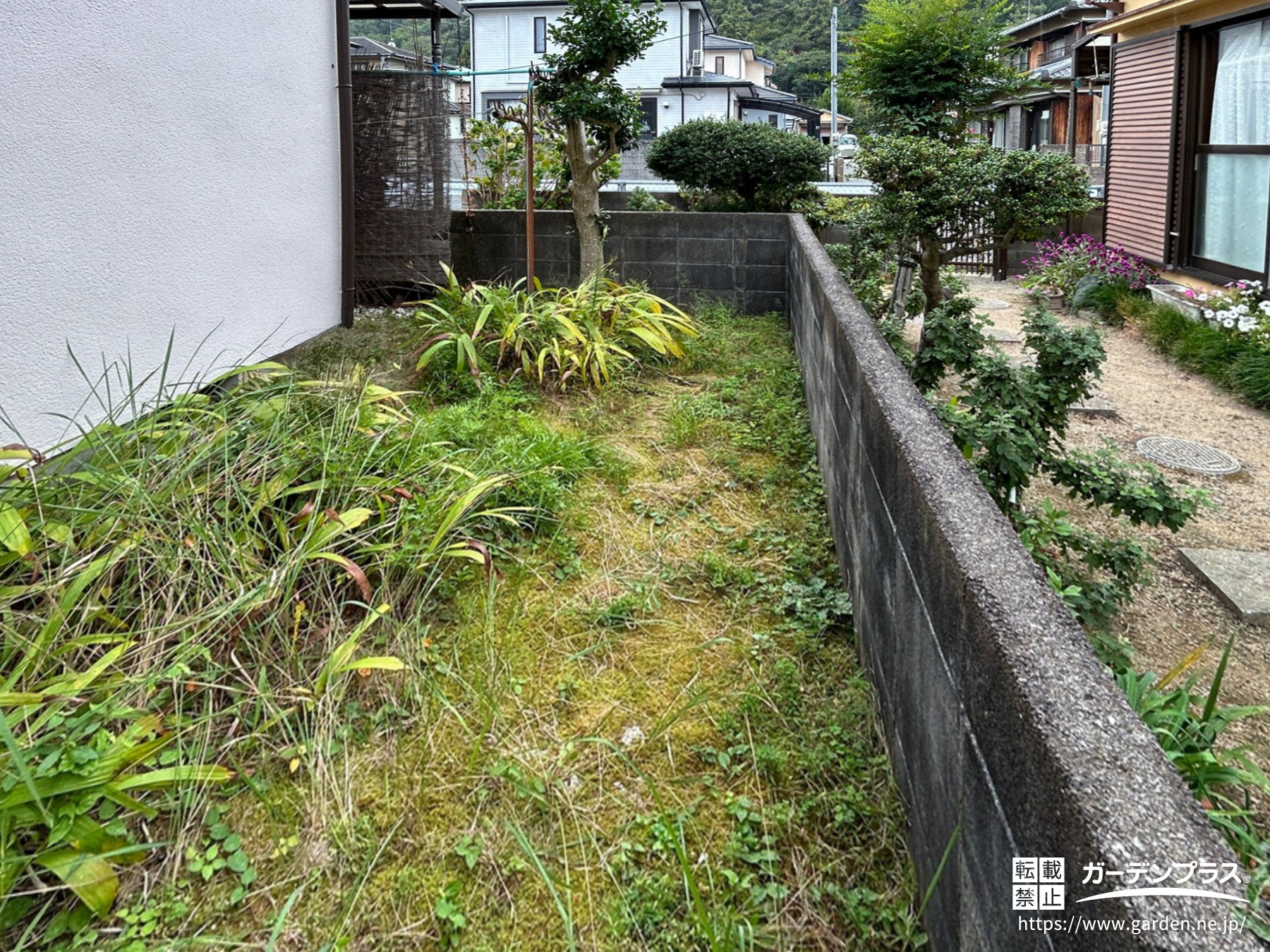 西陽がとても強く、午後になるとリビングへ一直線に日が差し込み、眩しさで過ごしにくい時間がありました。また、道路側からリビングの様子が見えやすい位置関係だったため、日常生活を送る上で視線が気になることがあり、プライバシー面での改善も必要でした。お庭全体をこれからリフォームしていく中で、お手入れの軽減だけでなく安心感も高められるよう、雑草対策とあわせて境界の見直しをご提案することになりました。