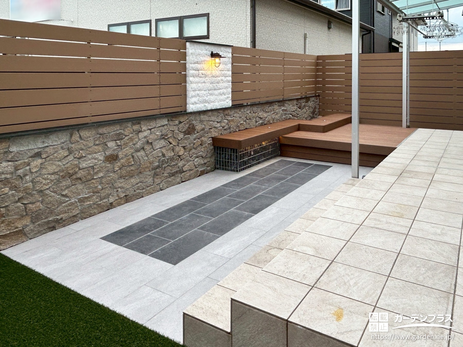 ウッドデッキの足元はメッシュフェンスでガビオン風に仕上げ、黒の割栗石を入れることで素材の対比がより引き立つ仕上がりに。また、床面には300×600サイズのタイルを2色使いで張り分けてリズム感を与え、お庭全体のモダンな印象をさらに強調させました。