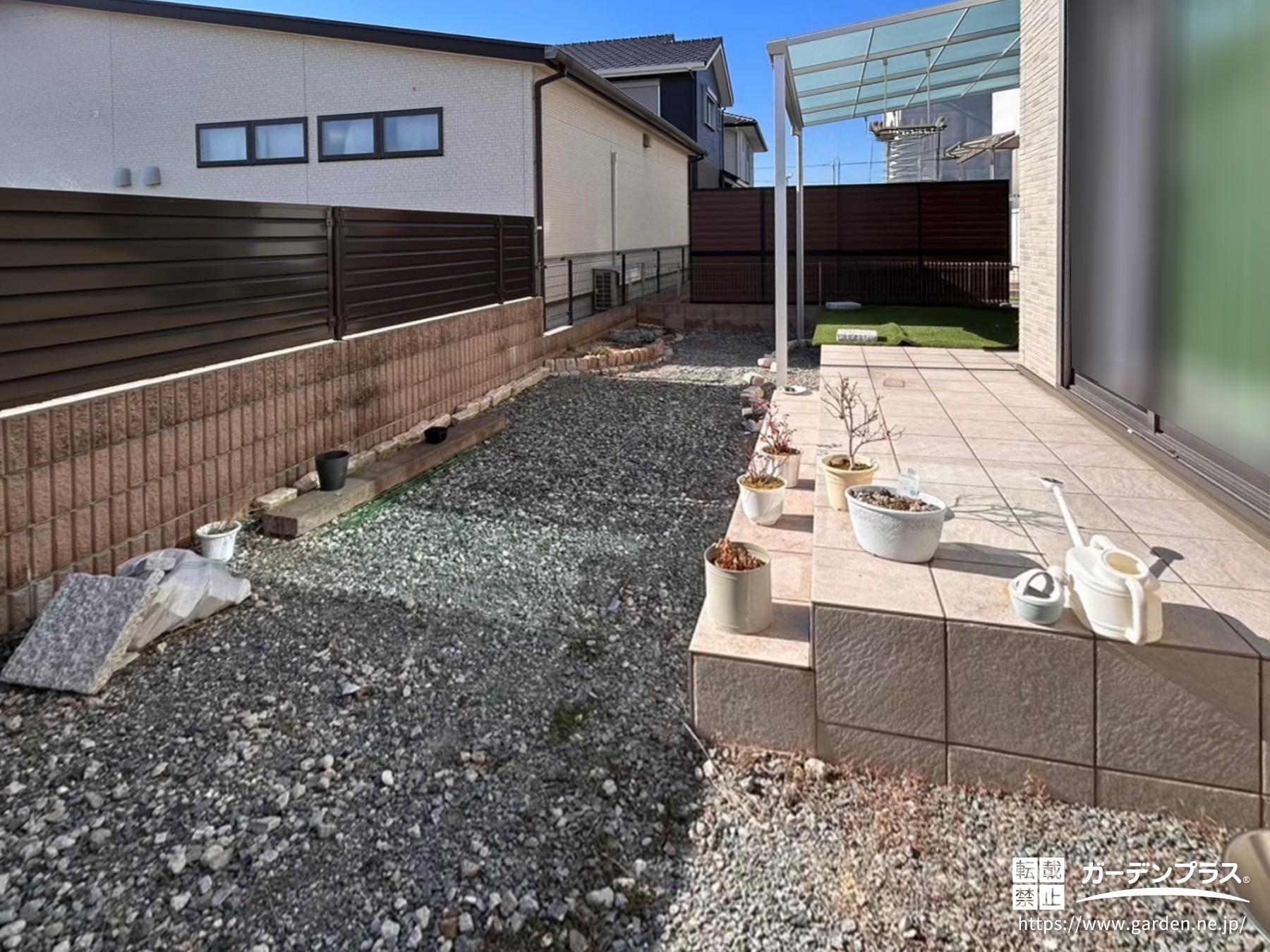 既存のブロックとフェンスに囲まれたお庭はまだ大きく手を加えていない状態で、砂利敷きが広がるシンプルなつくりでした。これからどのようにリメイクして、モダンで過ごしやすいリゾート風のお庭へと変わっていくのか、仕上がりを楽しみにしていただけるようなスタート地点です。