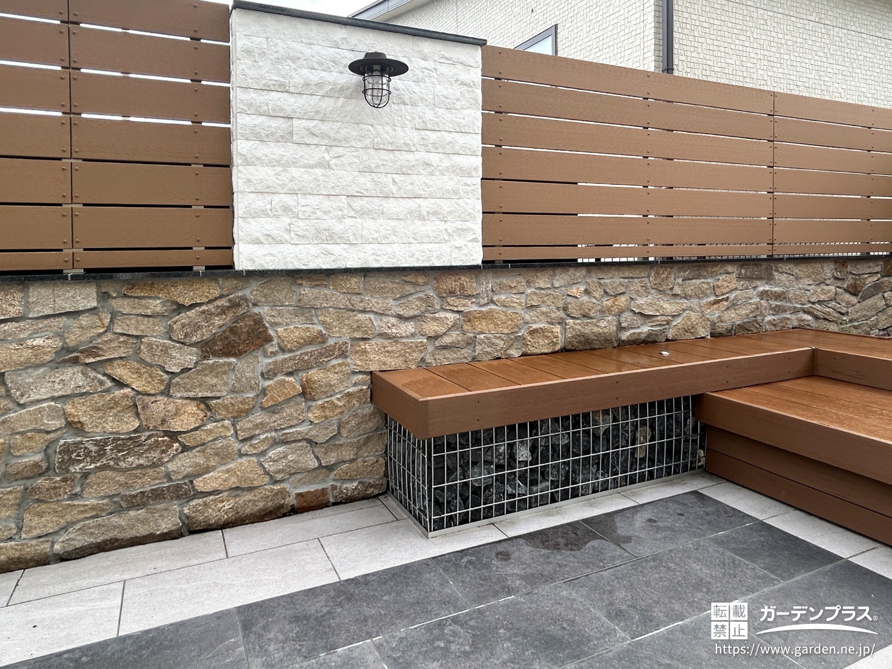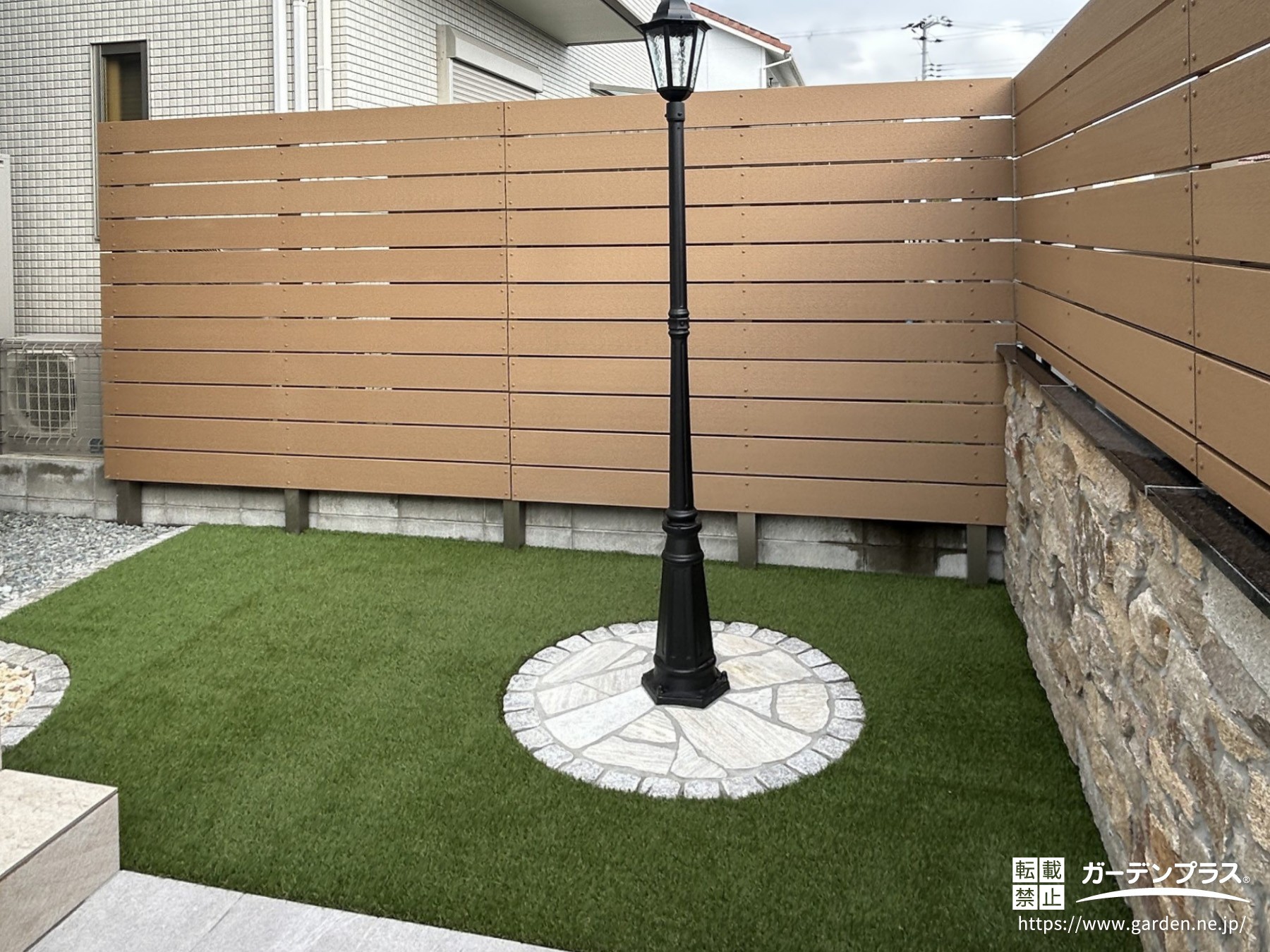土新建材の『エコモックフェンス』を取り付け、天然石を積み上げた塀とのバランスを考えながら、間には黒御影石でシャープな見切りを施しました。