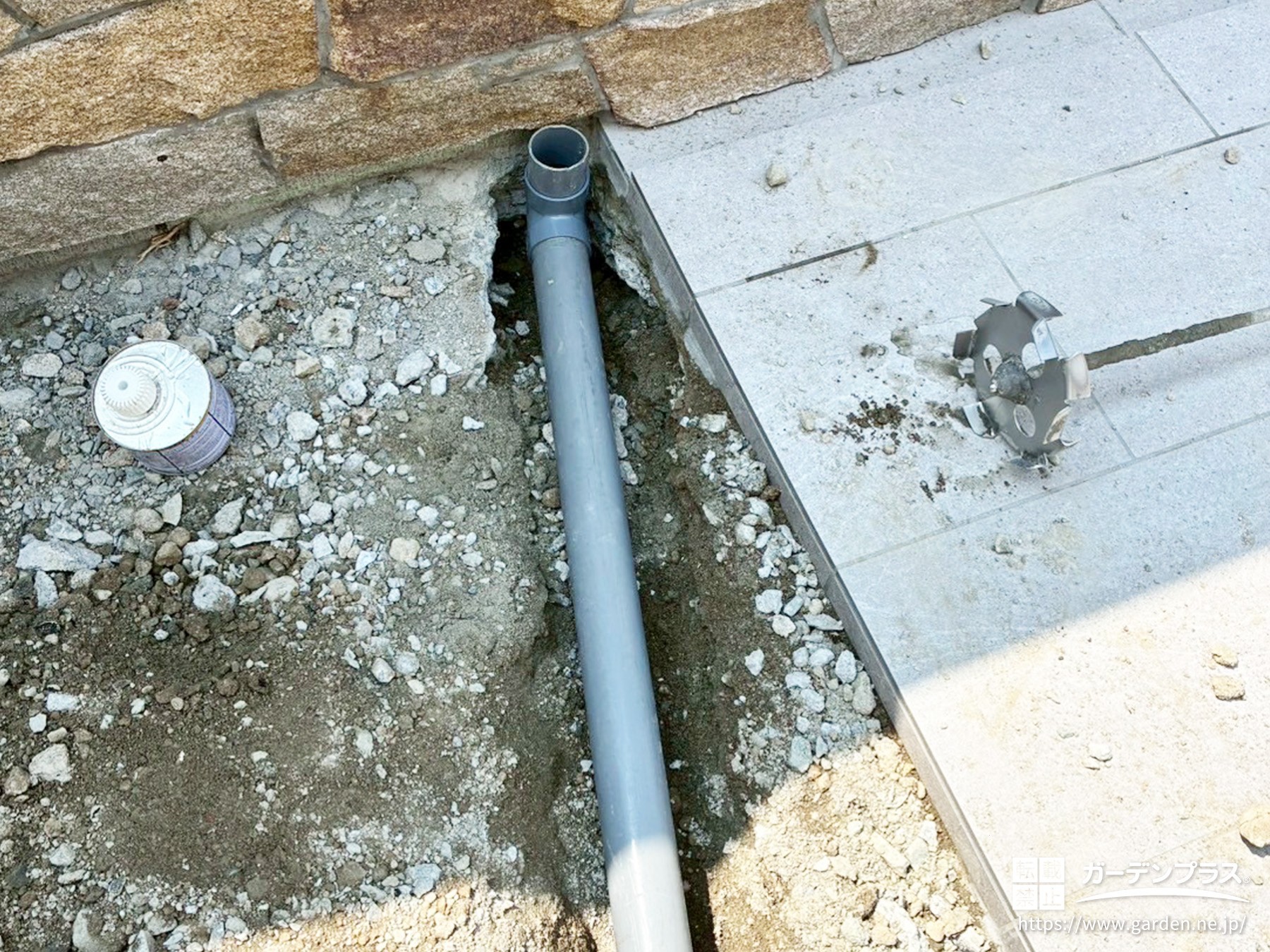 全体的に塀側へ向かって勾配を取り、壁際のタイル部分に細かな溝をつくることで、水が自然と流れるように設計しました。さらに、後から人工芝を敷設する予定の場所にはパイプを仕込み、雨水がスムーズに排水されるように工夫しています。こうした見えない部分も大切に施工することによって、リゾート風の心地よいお庭を長く楽しめる、安心感のある仕上がりを叶えました。