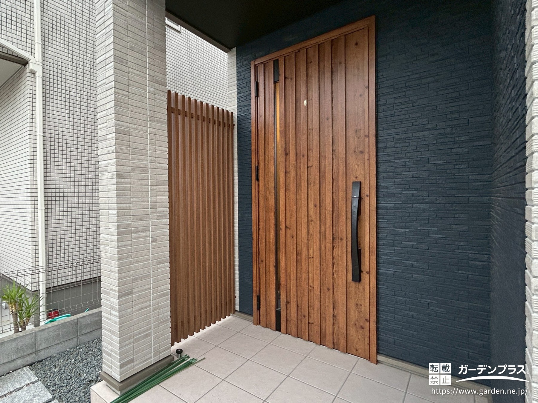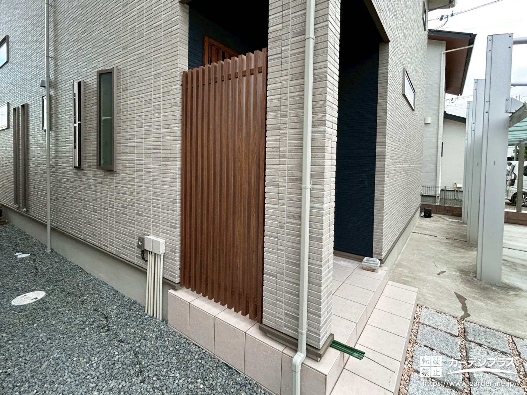 こちらはお住まいの玄関前です。玄関横のちょっとした隙間には目隠しフェンスを取り付け、視線が気になるという小さなストレスを解消しました。