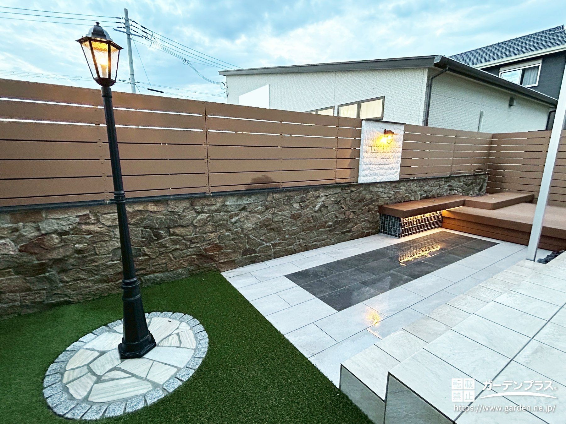 塀とフェンスの中央には白く輝く天然大理石の壁を設けて照明を取り付け、夜のライトアップで映える美しいアクセントをプラス。天端の見切りにも黒御影石を使い、全体を引き締めています。