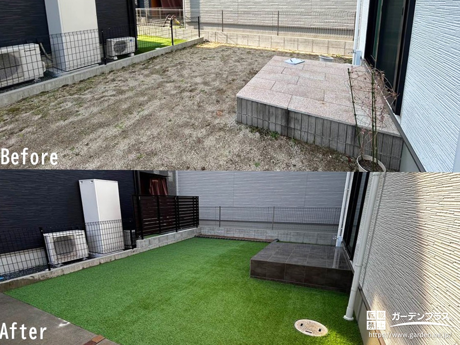今回の裏庭リフォーム工事は、約1週間で無事に完了しました。雑草に悩まされていた土の状態から、防草対策と人工芝を取り入れたことで、緑が広がる明るく心地よい空間へと生まれ変わりました。視線をやさしく遮るフェンスや、使い勝手の良いタイルデッキも加わり、毎日気持ちよく過ごせる裏庭に。長年のお悩みだった雑草対策とプライバシーの問題が解消され、暮らしをより豊かにしてくれるお庭が完成しました。このたびはご依頼いただき、誠にありがとうございました。