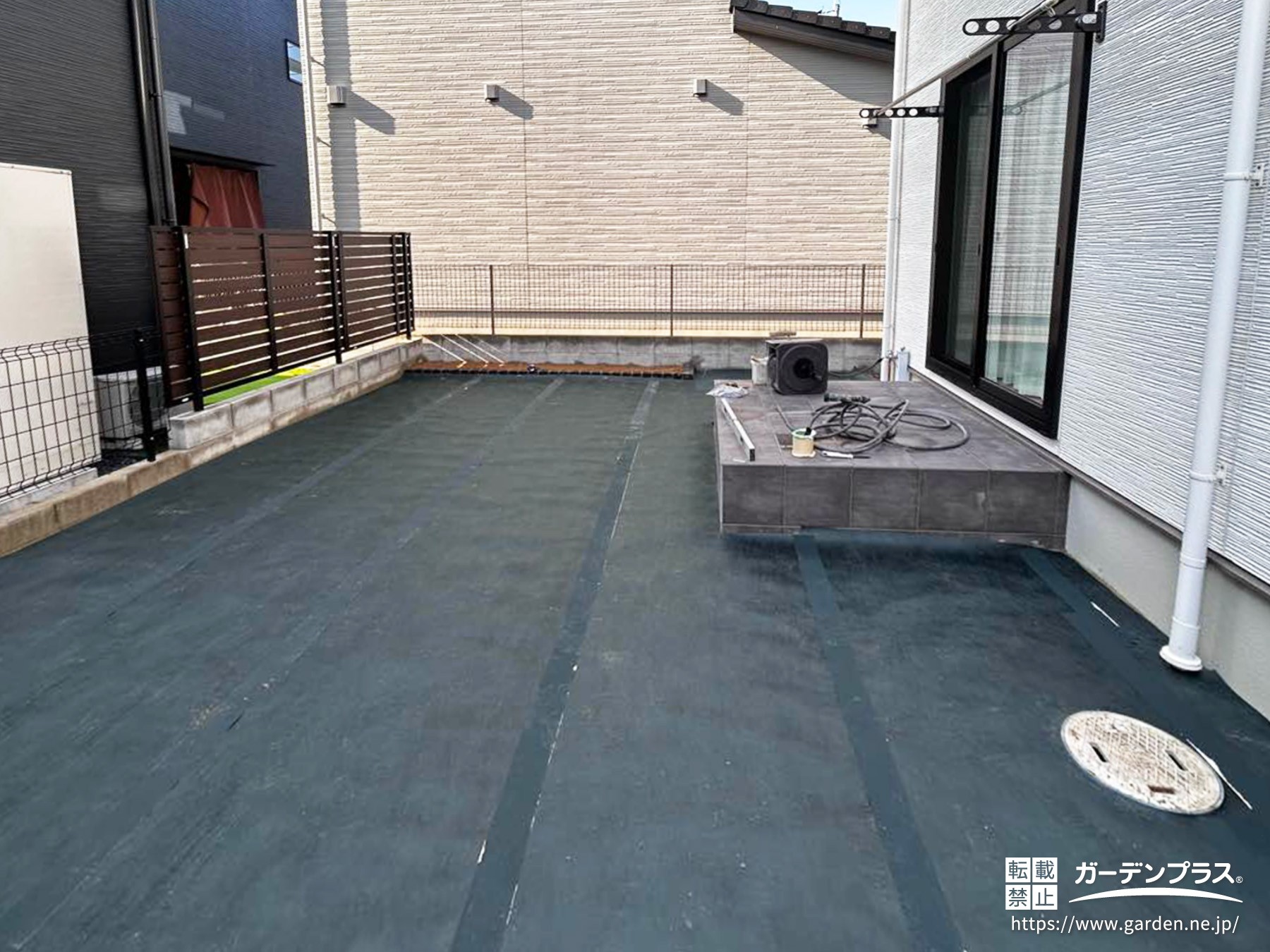長年そのままになっていた土の部分には雑草が点々と生えており、このままではお手入れの負担が大きくなってしまうため、人工芝を敷く前にしっかりと下準備を行いました。表面を丁寧に均し、下地に残っていた砂利や異物を取り除くことで、凹凸のないきれいな地盤に整えています。人工芝は下地の状態が仕上がりや耐久性に大きく影響するため、この整地作業がとても重要なポイント。将来的な劣化や破損を防ぐためにも、防草シートを敷く前には必ず平坦になるよう整えることが欠かせません。