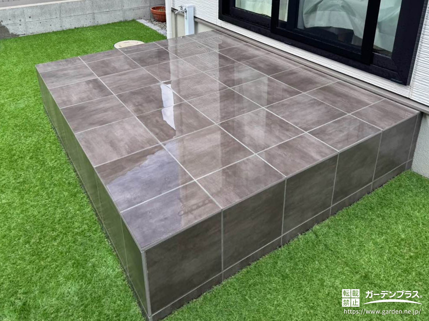 既存のデッキは平板を一度すべて撤去し、新たにタイルを貼り直しました。