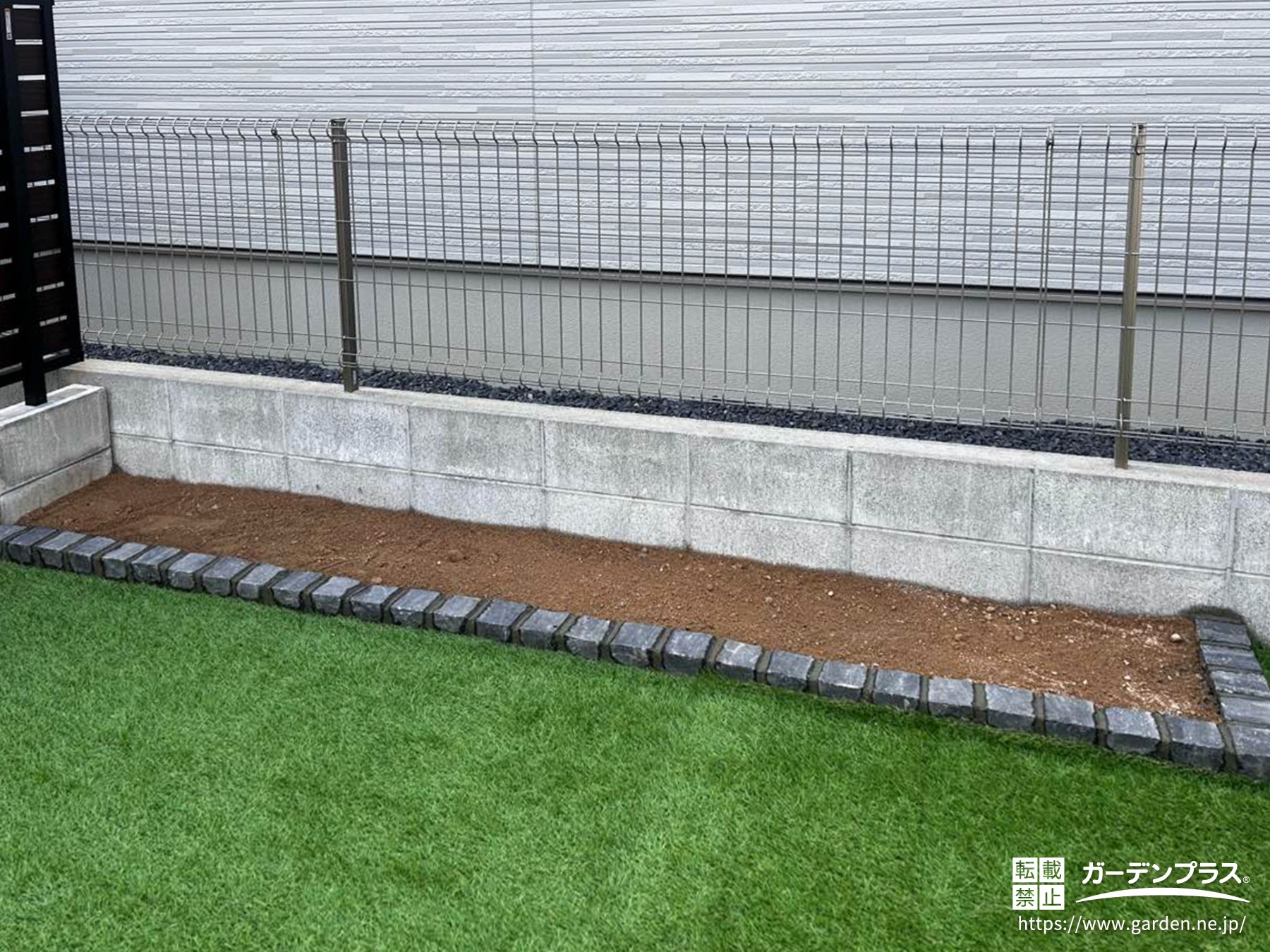 工事の途中では、花壇を追加したいとのご相談もいただき、人工芝を敷く前に対応させていただきました。