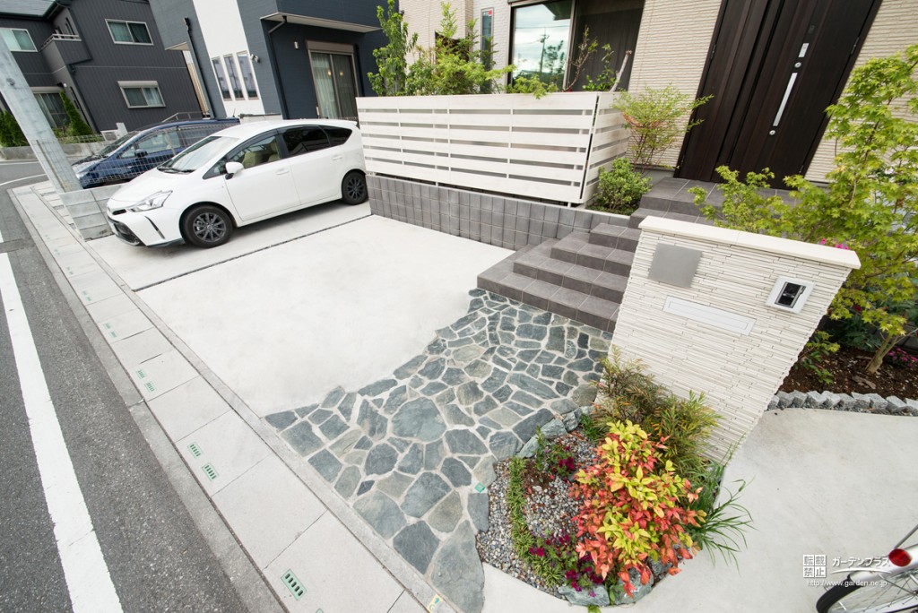 こちらも駐車スペースと隣接するアプローチですが、土留めの白の塗り壁や外壁の色とも美しいコントラストを生み出しているのが特長です。少し茶色がかっている石もありますがこれは石の風合い。鉄平石などの鉄を含んだ石は黒の色彩にランダムに茶色の色彩が混じり、自然由来の美しい舗装を可能にしてくれます。