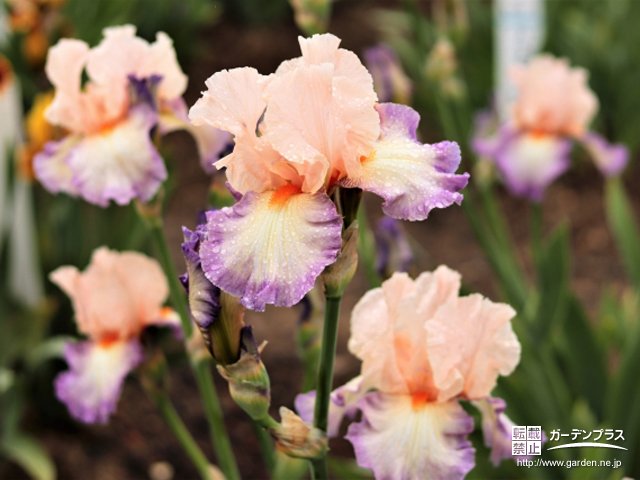 ジャーマンアイリスは、1800年代から地中海沿岸や小アジア原産の何種類かのアイリスを交配して出来た品種。日本ではヨーロッパで初期に作られたゲルニカ種が入ってきたので、ジャーマンアイリスと呼ばれるようになりました。今ではヨーロッパやアメリカ西海岸でも盛んに交配されています。ほかのアヤメ属と見分けるポイントは、花びらの付け根のブラシ状の毛です。この毛のために「髭アイリス」と呼ばれることもあります。