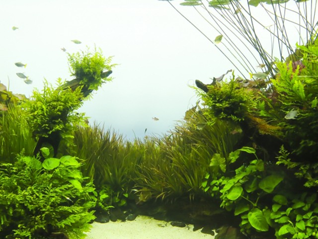 また水草を植栽するときにぜひ組み合わせてほしいのが、流木や自然石。ダイナミックで奥行きのある水景を作ることができます。活着するシダを枝に巻き付けて苔むした表現をしたり、中国の山水画のような崖や滝のイメージを作るときにもおすすめです。