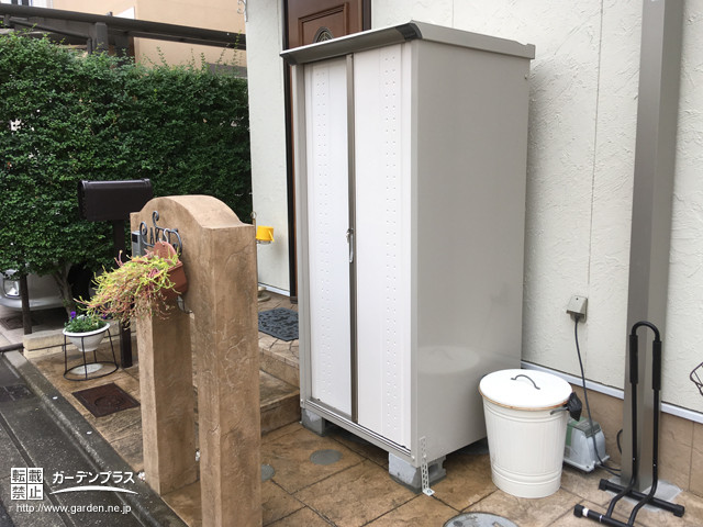 こちらも自転車や背の高い道具も収納できるように、通常の収納棚とオープンスペースを組み合わせたコンビ型物置を設置したお庭です。シャベル、ほうきなどの毎日使うものを屋根の下に収められるようになりました。