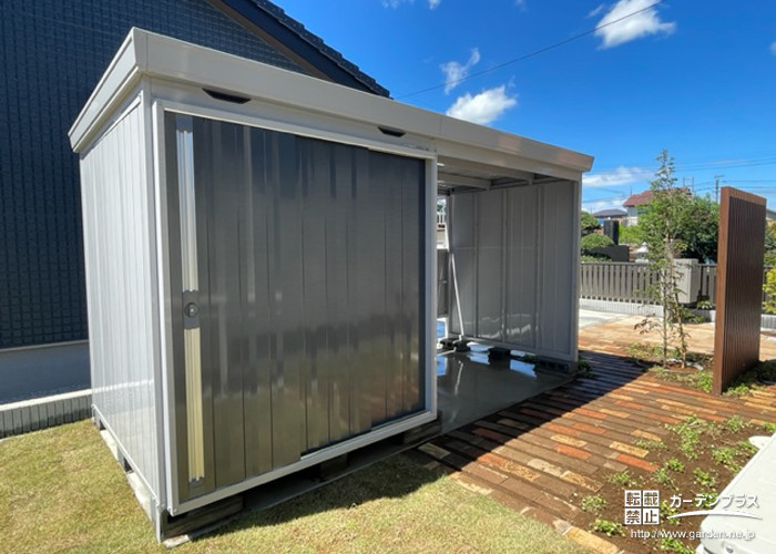 大型の物置を設置。こちらの物置には雨に濡れない駐輪スペースがついています。