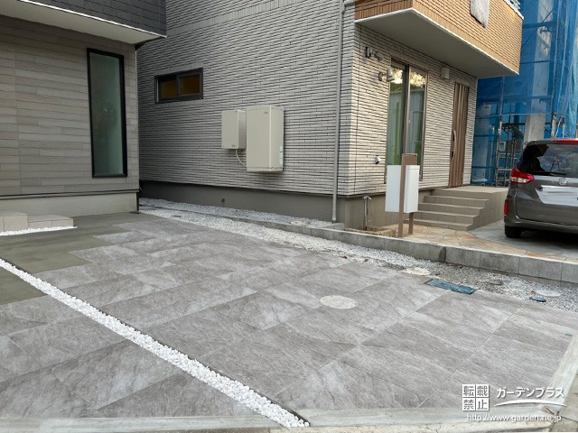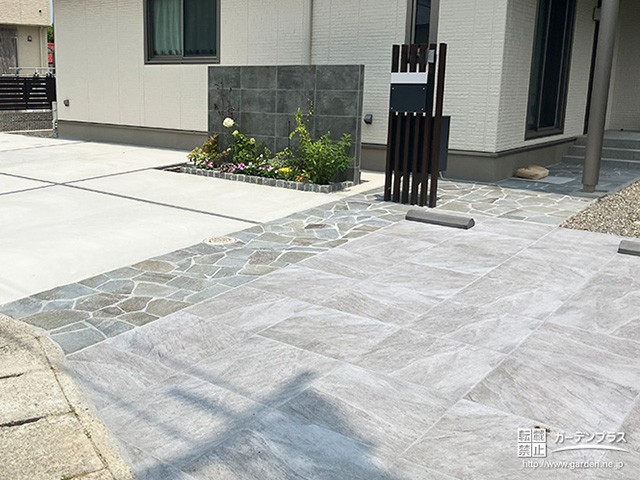 さらに、アプローチや門まわりと同じタイルを採用することで外構全体に統一感が生まれ、お住まいのファサード全体をワンランク上の雰囲気に演出できます。サイズの異なるタイルを組み合わせてリズム感を出したり、アクセントとして一部に異素材を取り入れるのもおすすめです。たとえば木目調や石目調のタイルを混ぜると、ナチュラルさや高級感を表現でき、駐車場でありながらデザイン性の高い空間に仕上がります。