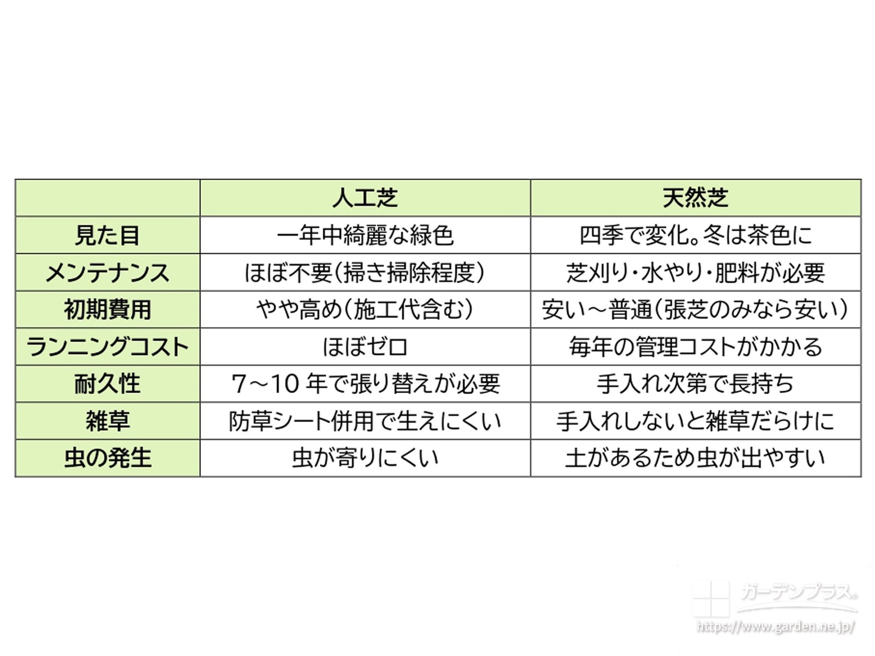 季節ごとの変化を楽しめるのは天然芝ならではの魅力ですが、メンテナンスフリーかつ美観性を重視するなら圧倒的に人工芝のほうが安定しています。