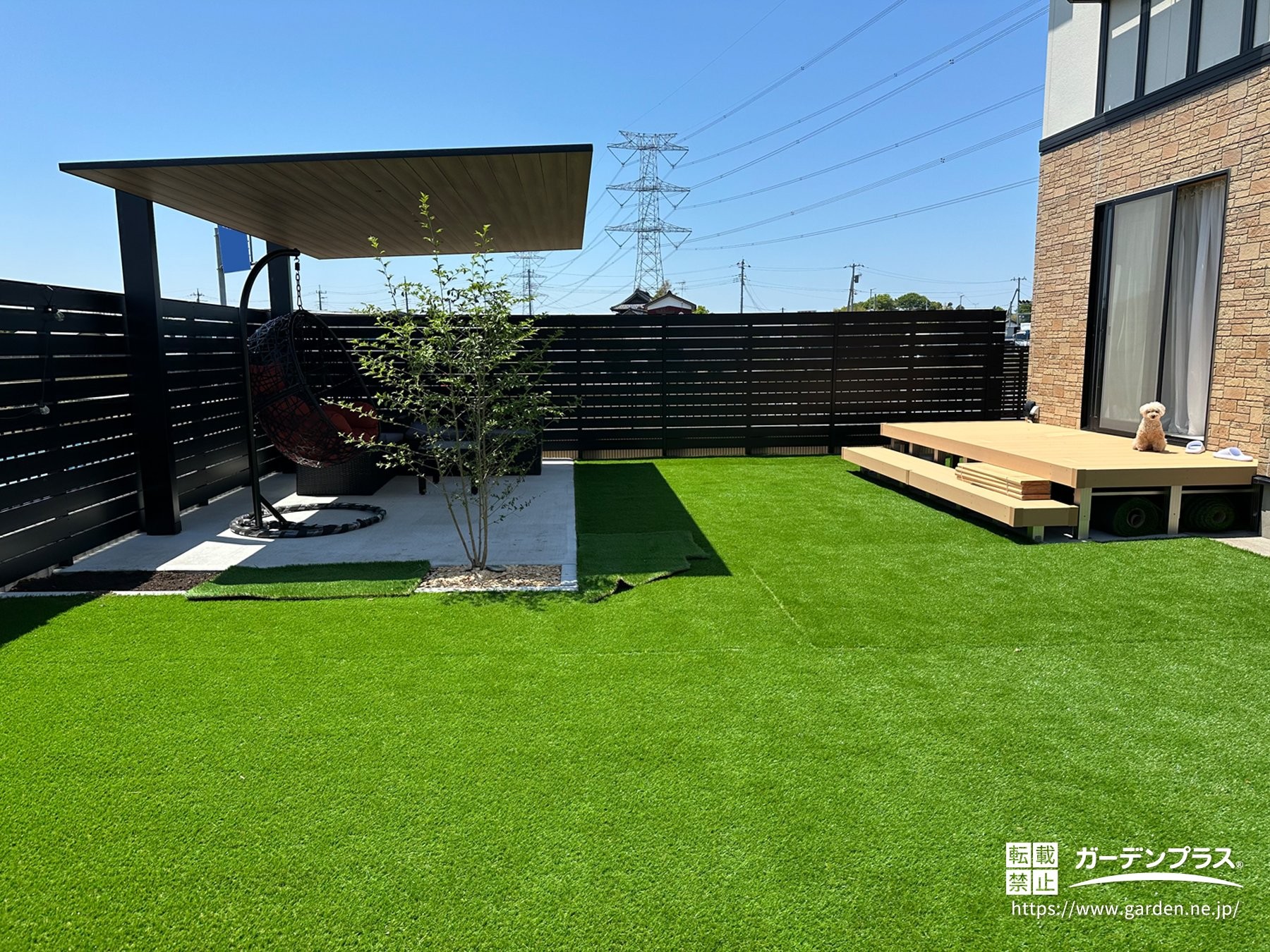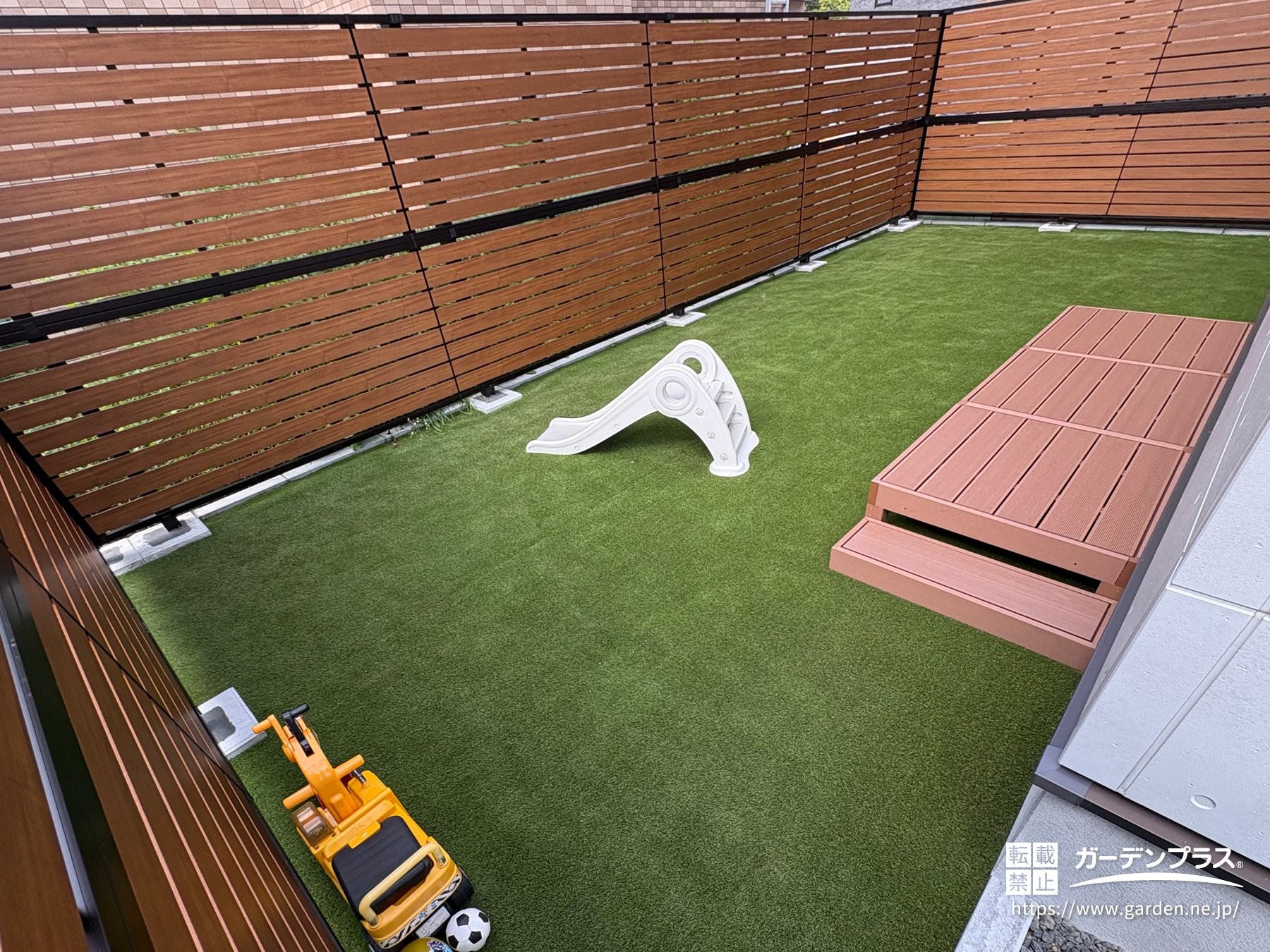 防草シート+人工芝でふんわりとした足ざわりのお庭。木調フェンスで視線をほどよく遮り、お子様が安心して遊べる落ち着いたプライベートな空間です。
