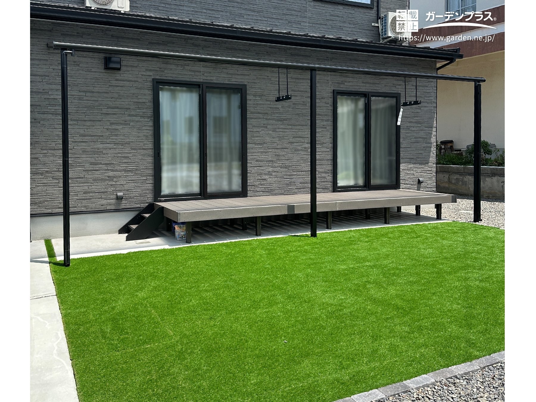 人工芝にテラス屋根と物干しを組み合わせ、洗濯や日常使いに便利なスペースに。見た目と機能性を兼ね備えた、快適に過ごせるお庭です。