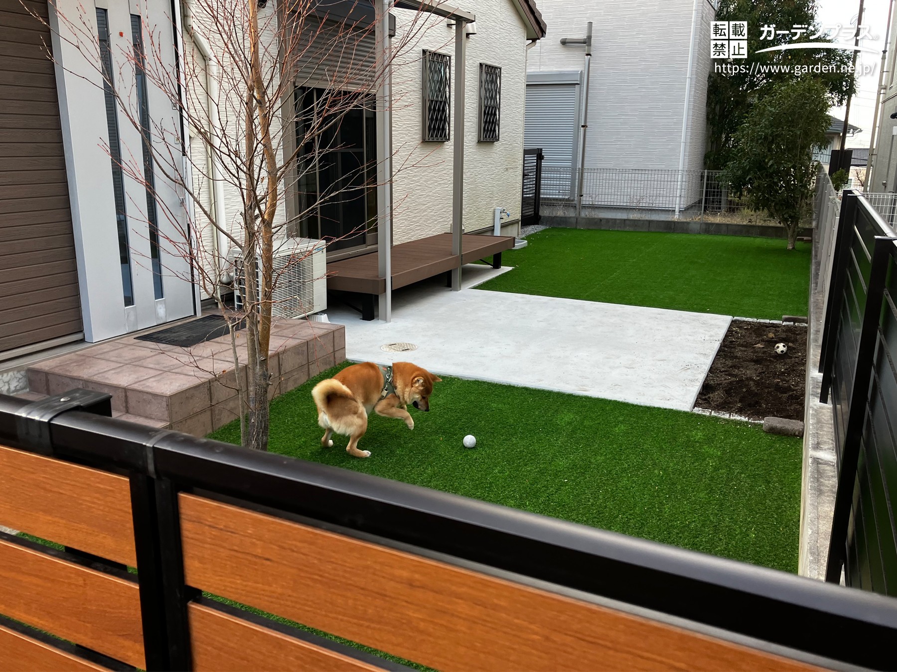 庭木を撤去してスペースを確保し、防草シートと人工芝でドッグランを新設。