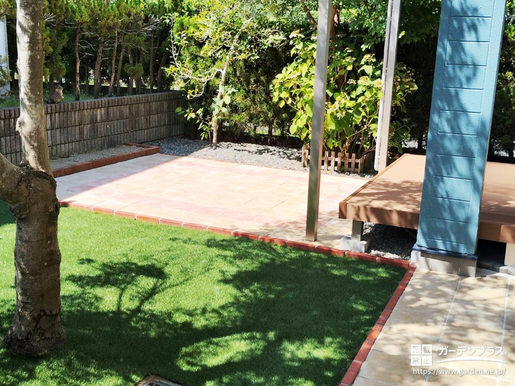 デッキ横の庭木もレンガで囲い、活かした計画にしました。