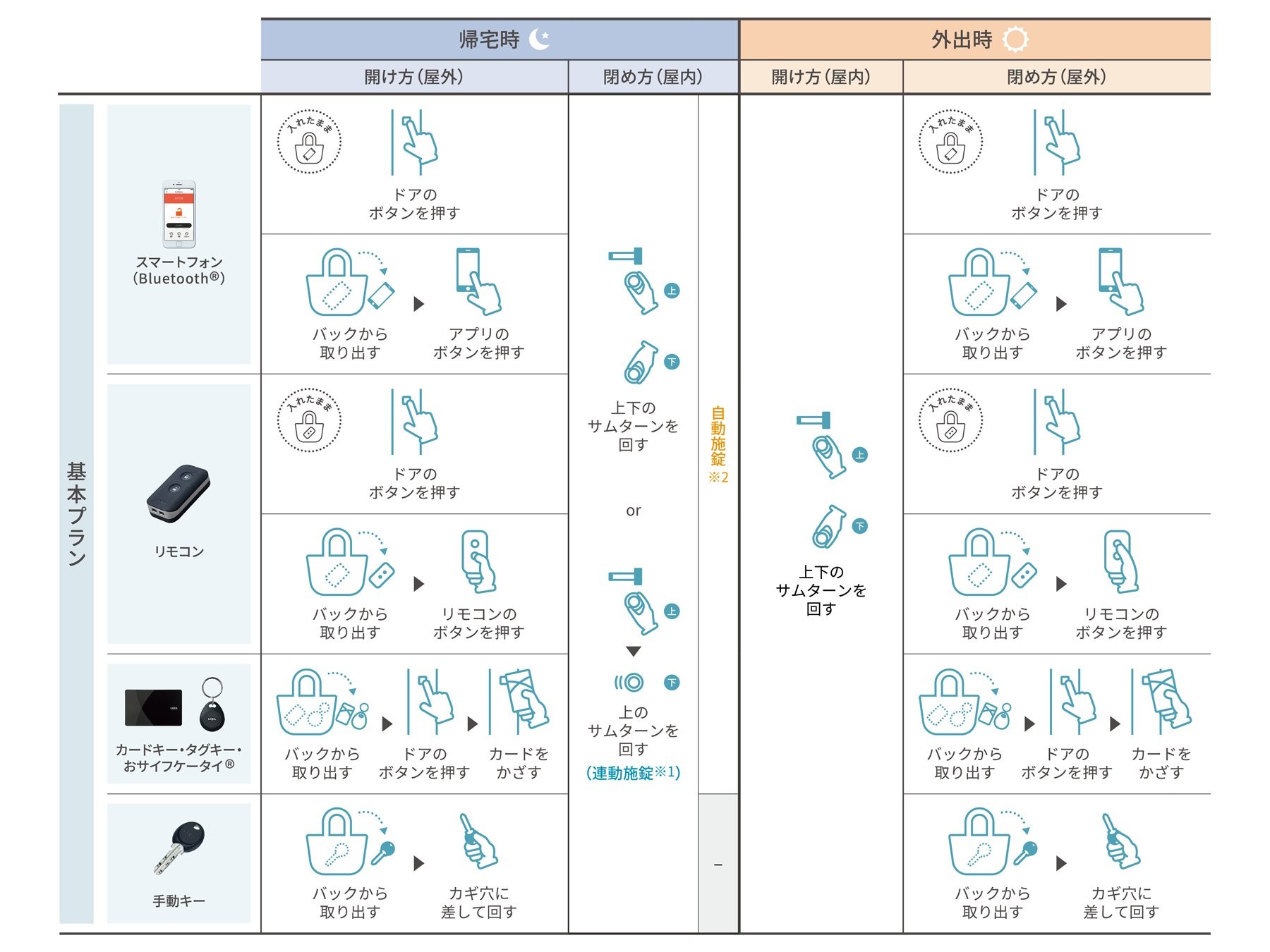 スマートフォンやカードキー、リモコンキーを使って、鍵を取り出さずに施錠・解錠ができます。