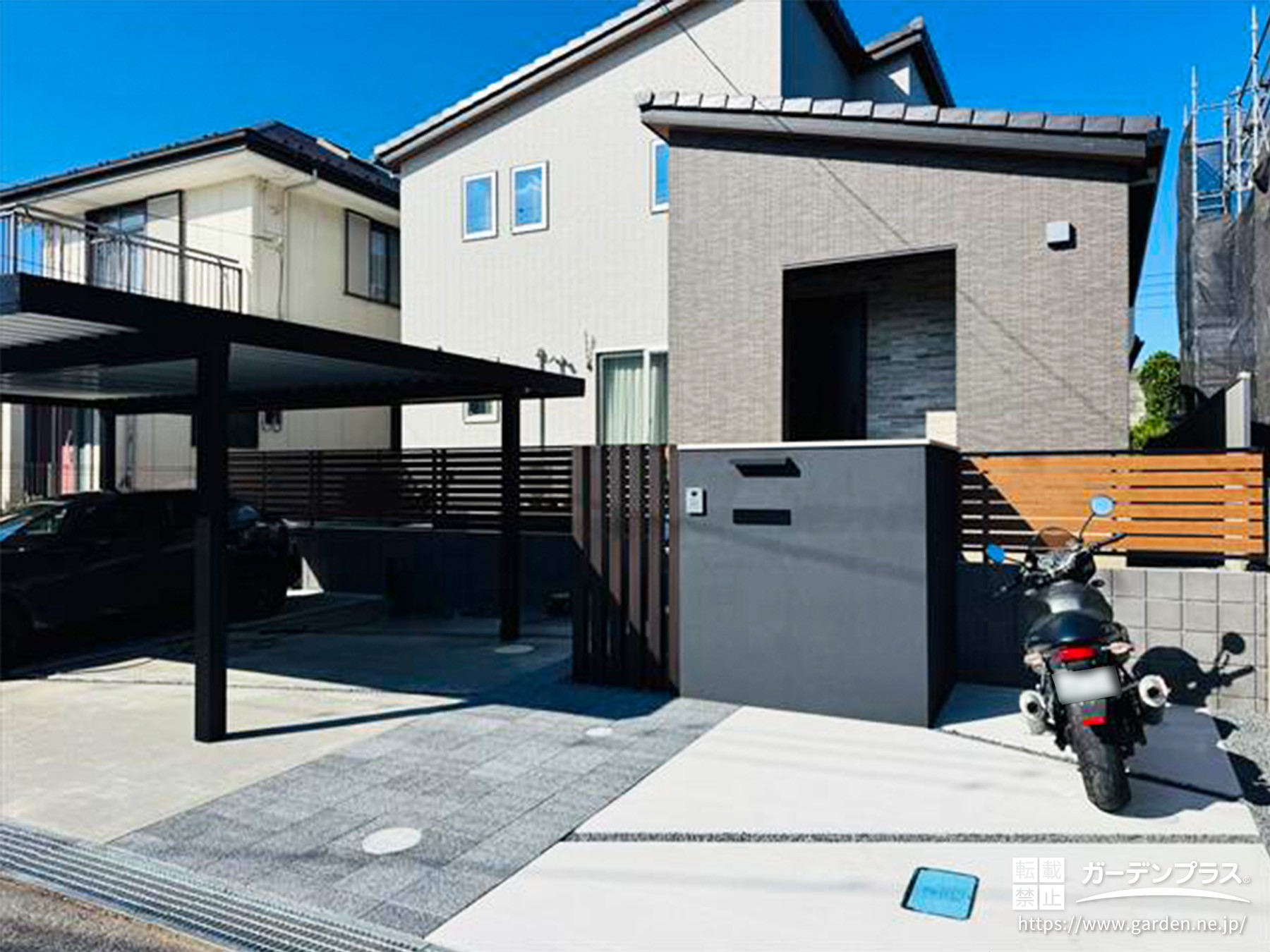 屋根付きの駐車スぺースが整ったことでお住まい全体の動線もスムーズになり、造作門柱や目隠しフェンスと調和したおしゃれな外構にまとまりました。カーポートは雨や雪、紫外線からお車をしっかり守ってくれるだけでなく、霜や鳥のフンといった汚れを防げるため、お車の日々のお手入れの負担が軽くなるのも嬉しいポイントですね。