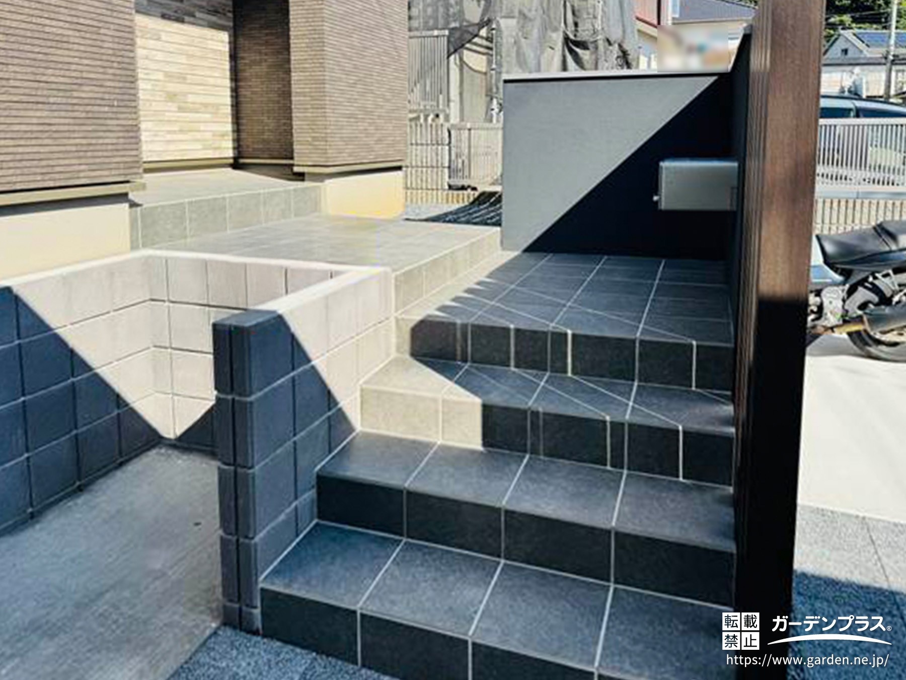 玄関ポーチ階段と同じタイル仕上げを採用しているため、一体感のあるデザインにまとまり、おしゃれに仕上がっています。